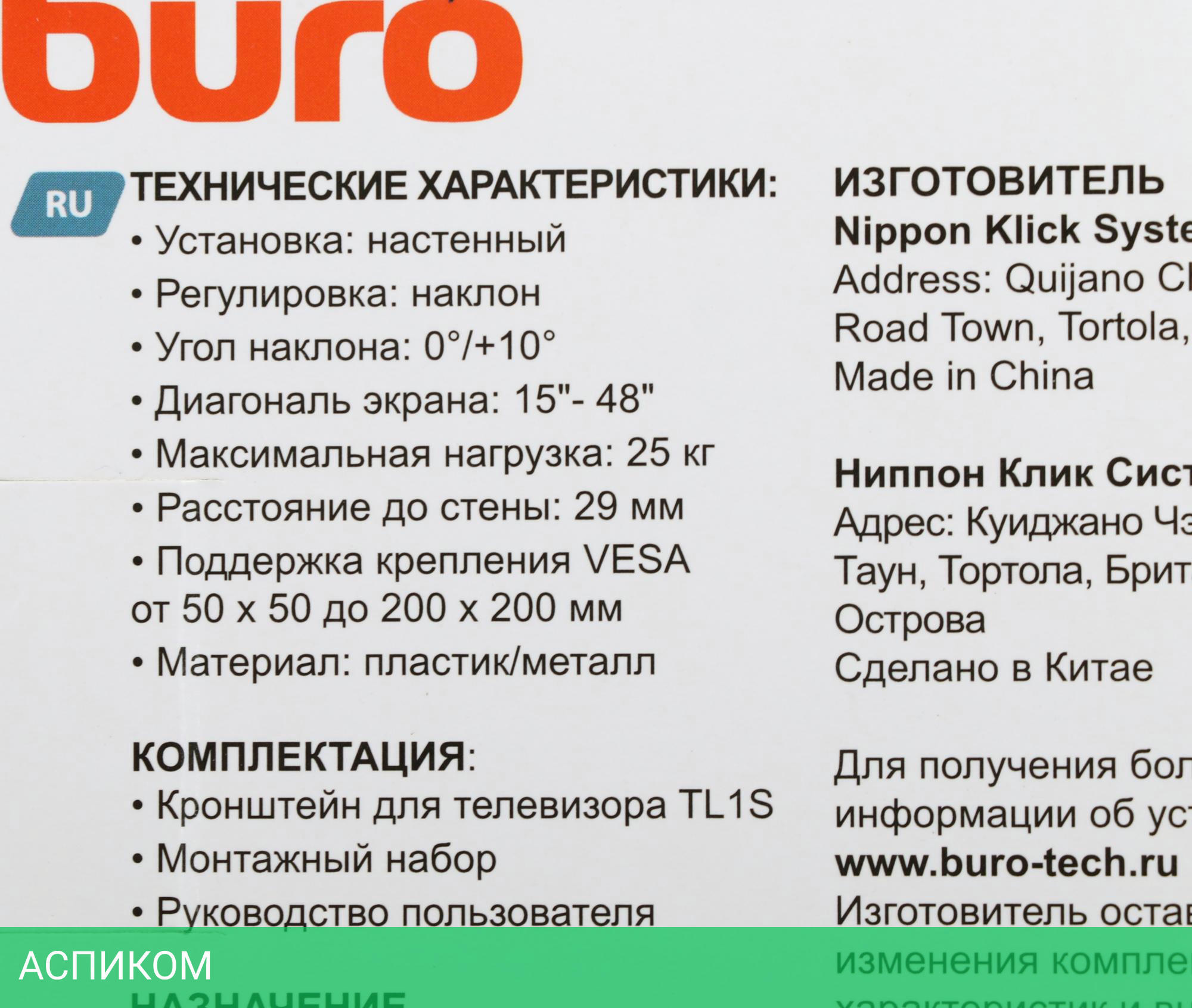 для телевизора / черный / настенный / 15.0 / 48.0 / 10