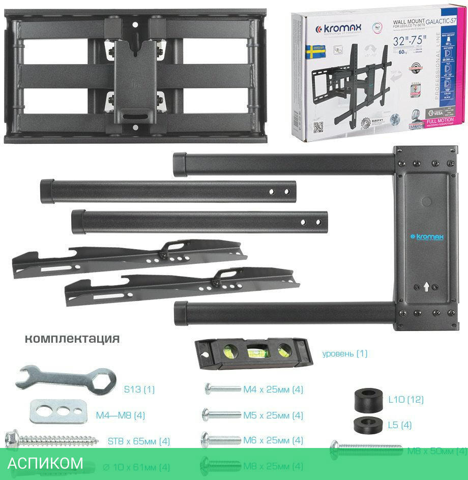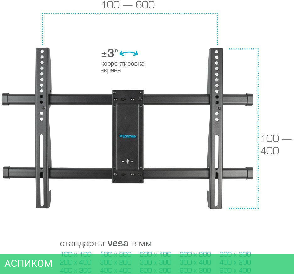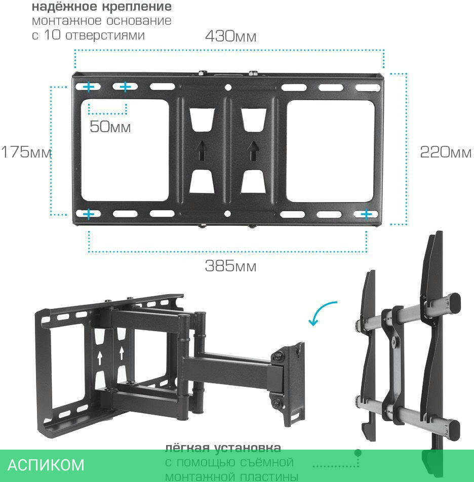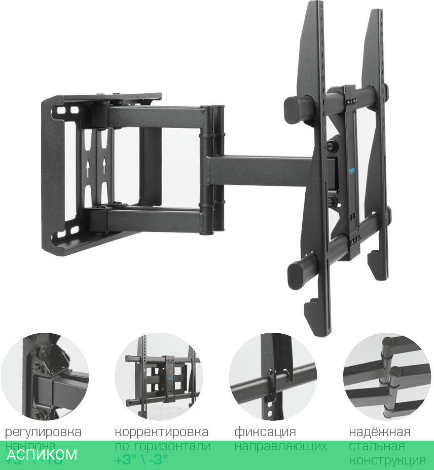Усиленное настенное основание, Надежная стальная конструкция максимальная нагрузка до 60 кг, Универсальная система крепления, Легкий монтаж при помощи съемной монтажной пластины, Корректировка экрана - уникальная возможность вращения экрана на ±3° относительно стены