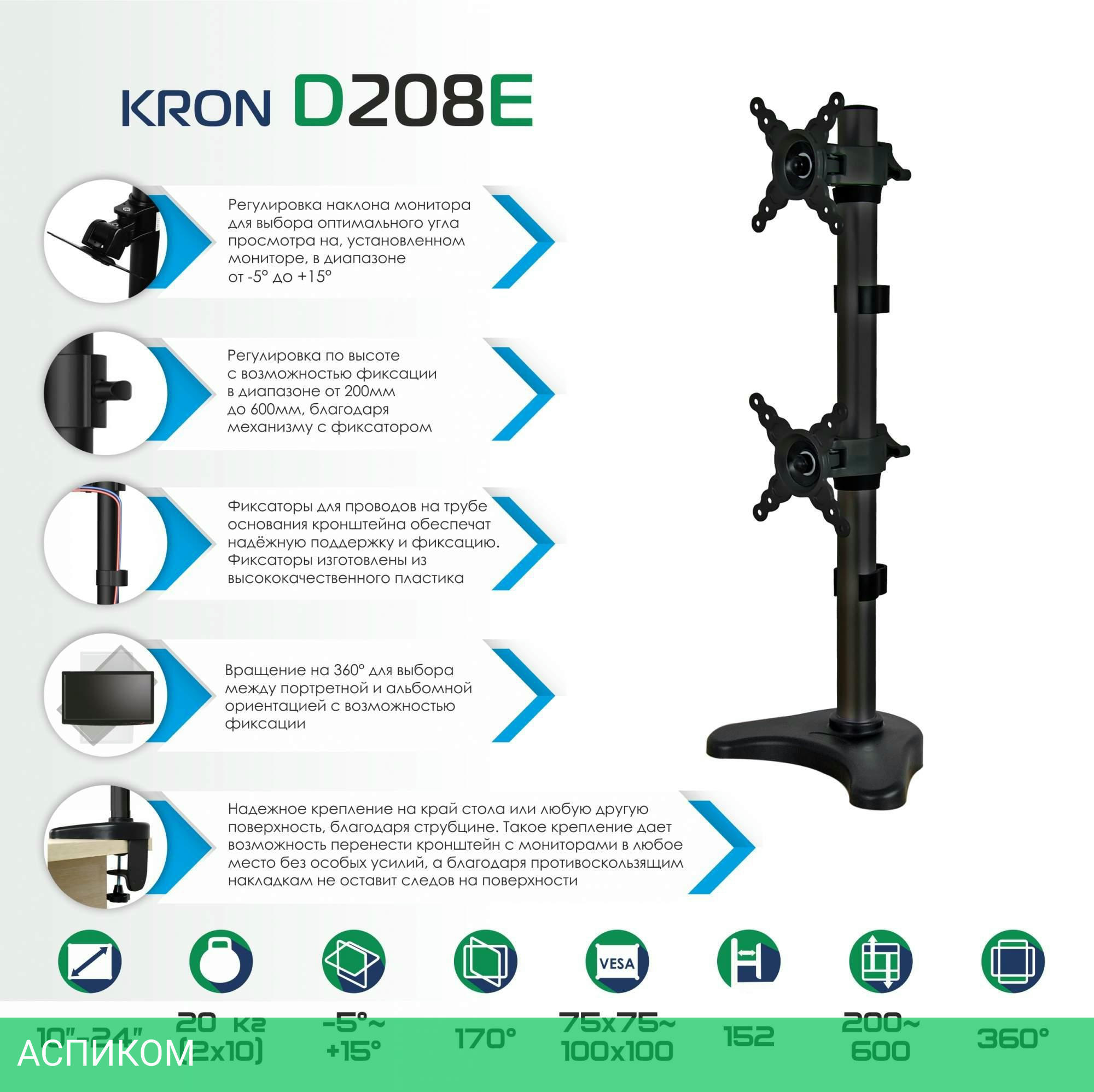 поворотный, с регулировкой высоты, кабель-канал, струбцинное крепление