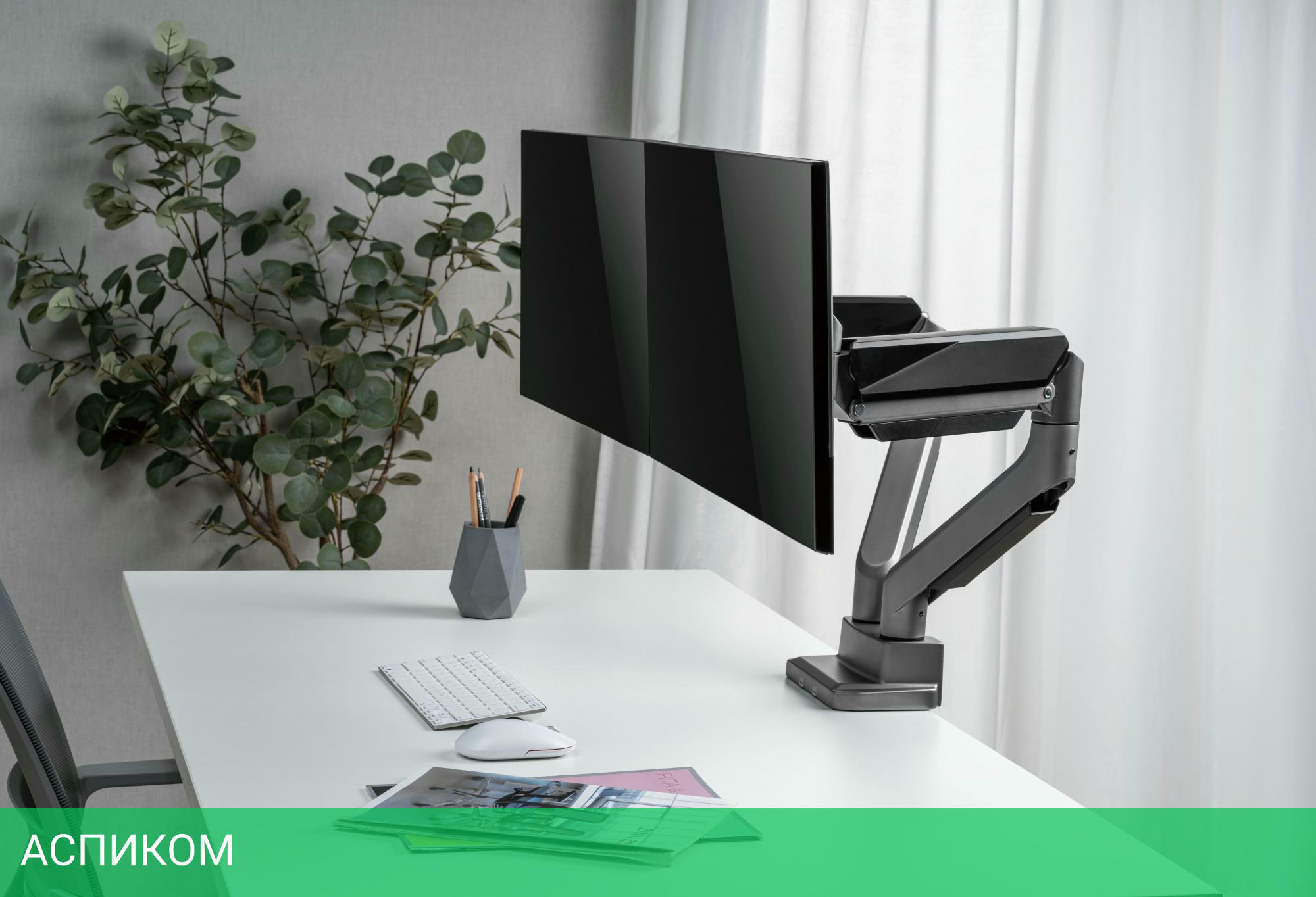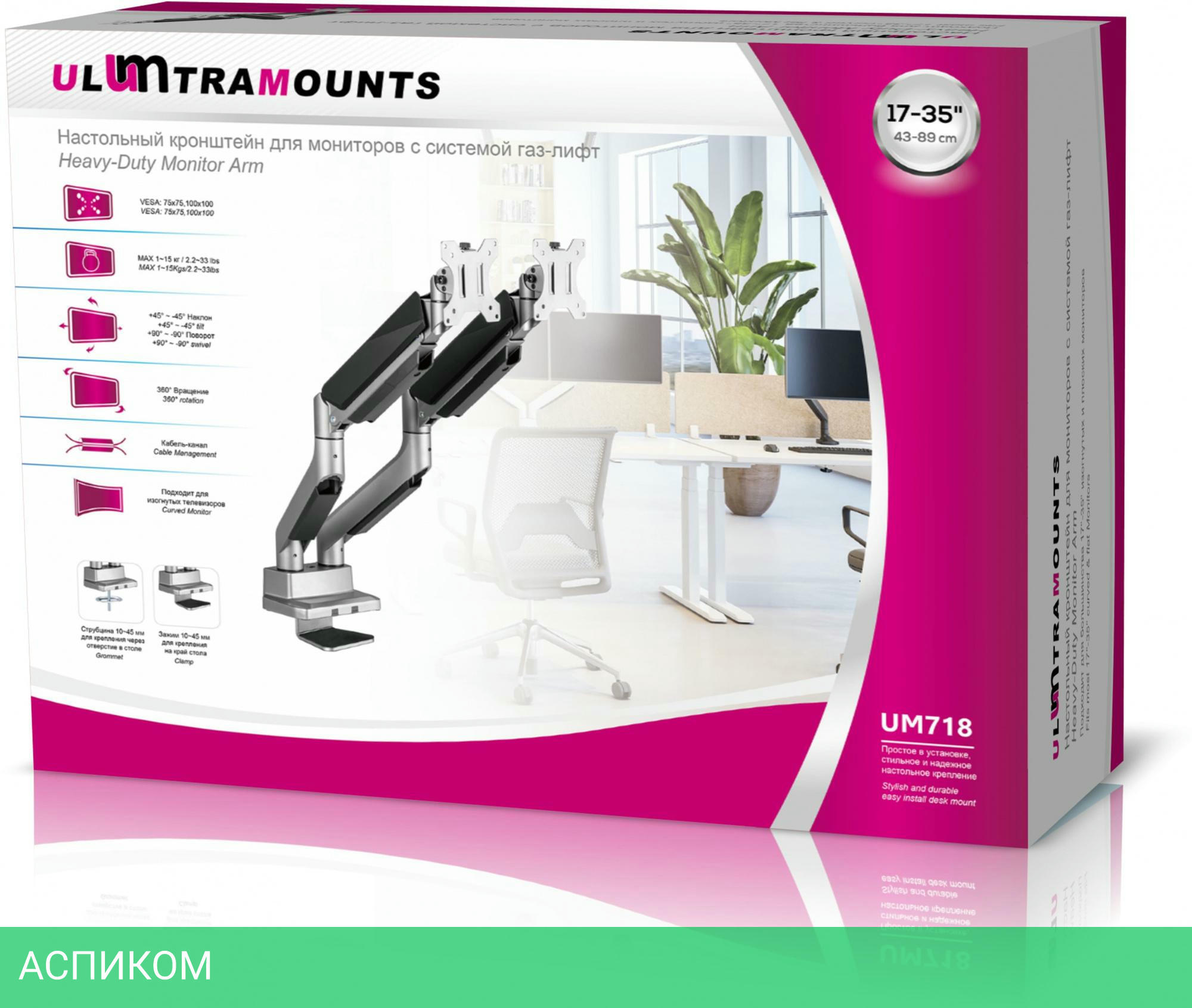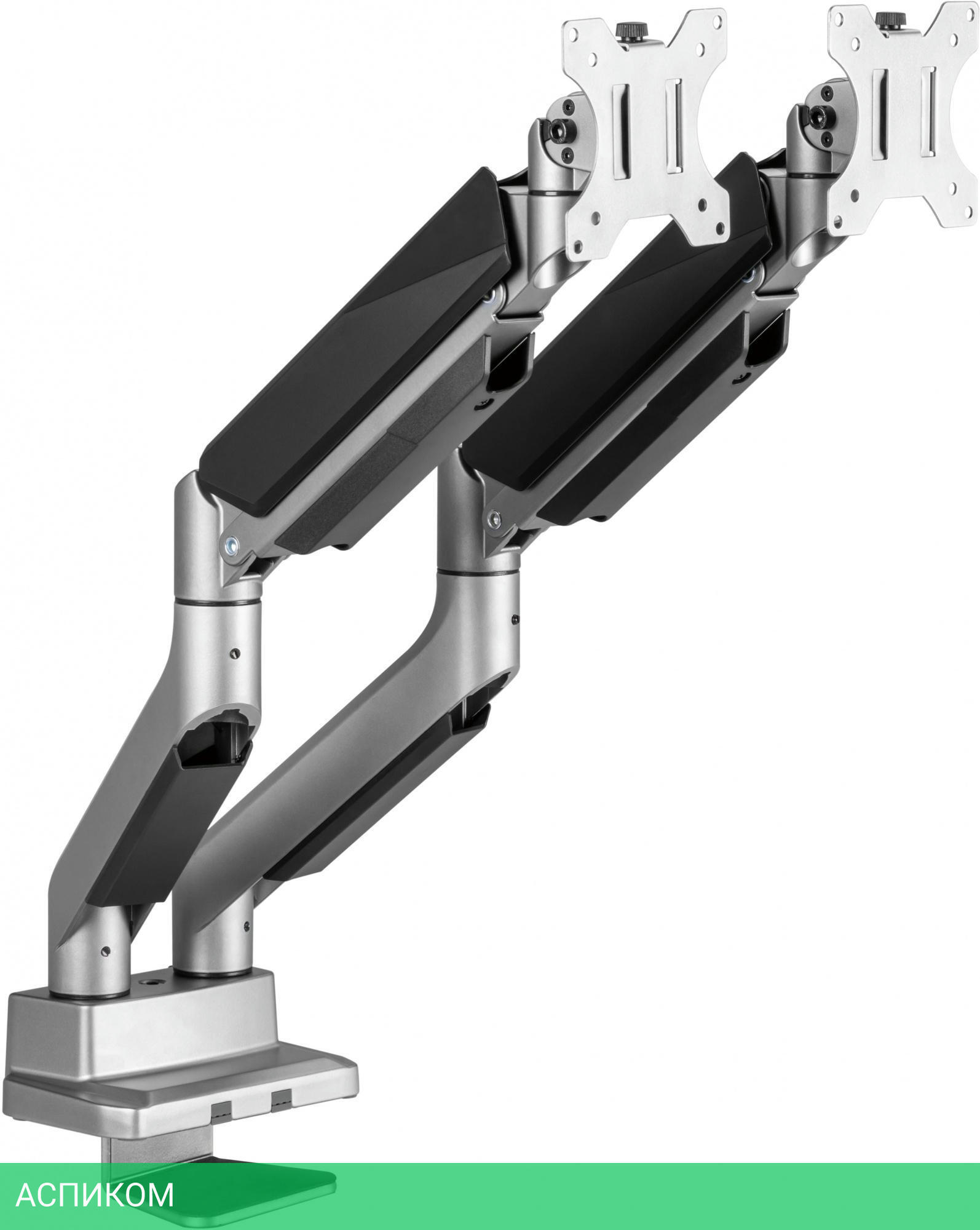 Настольный кронштейн для монитора с системой газ-лифт. Конструкция со свободным наклоном позволит легко регулировать наклон вперед или назад для лучшего обзора и уменьшения бликов.