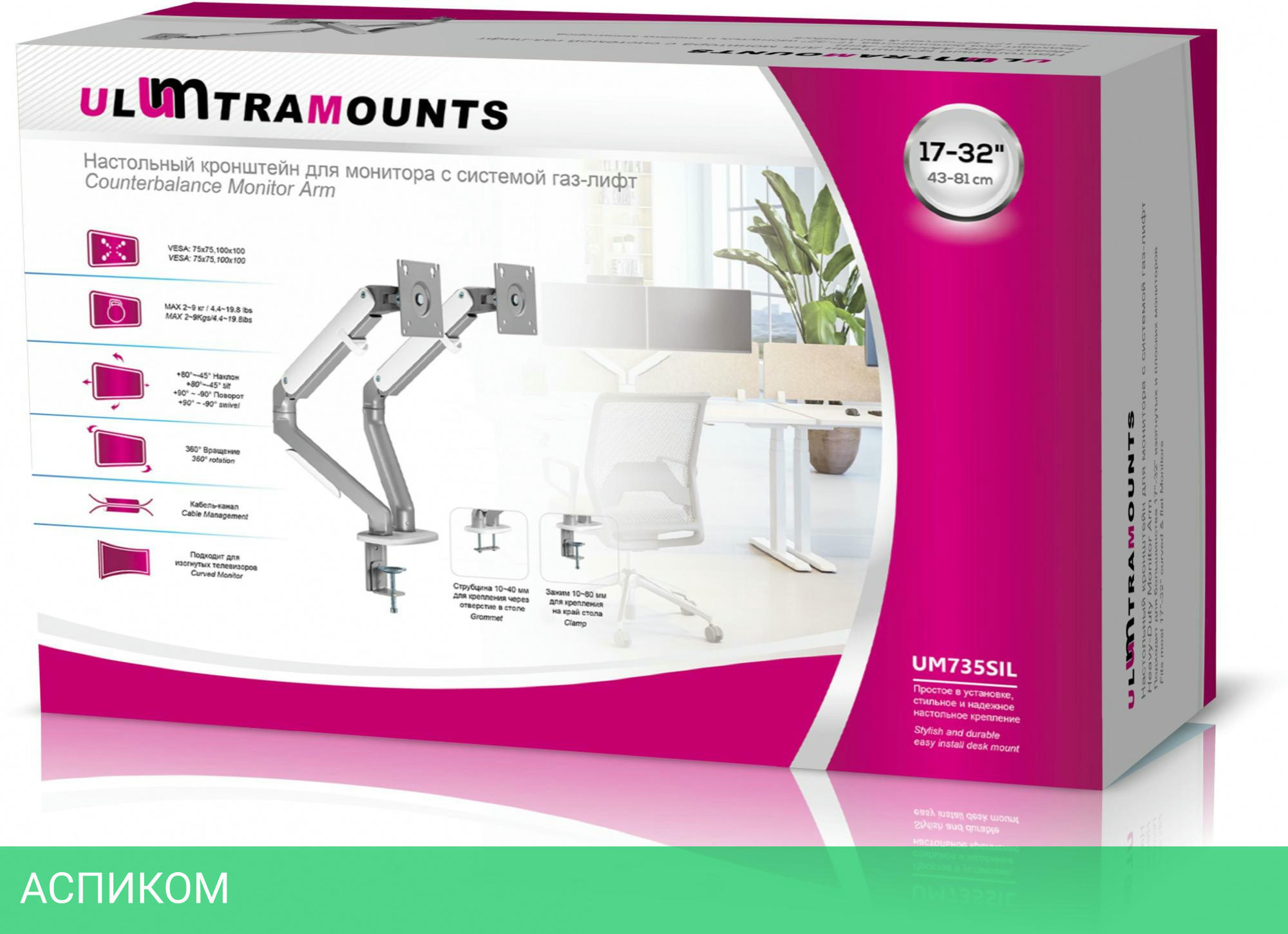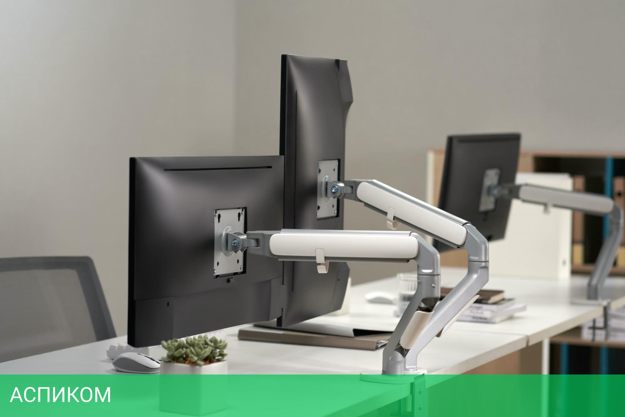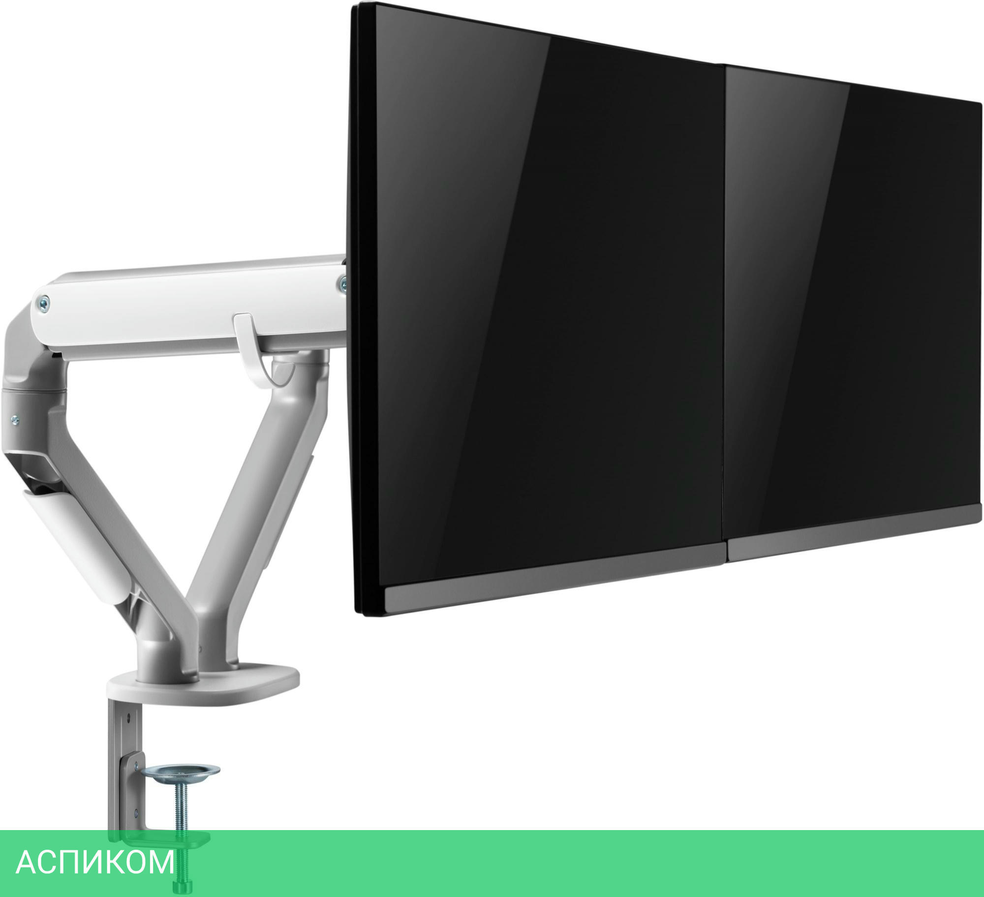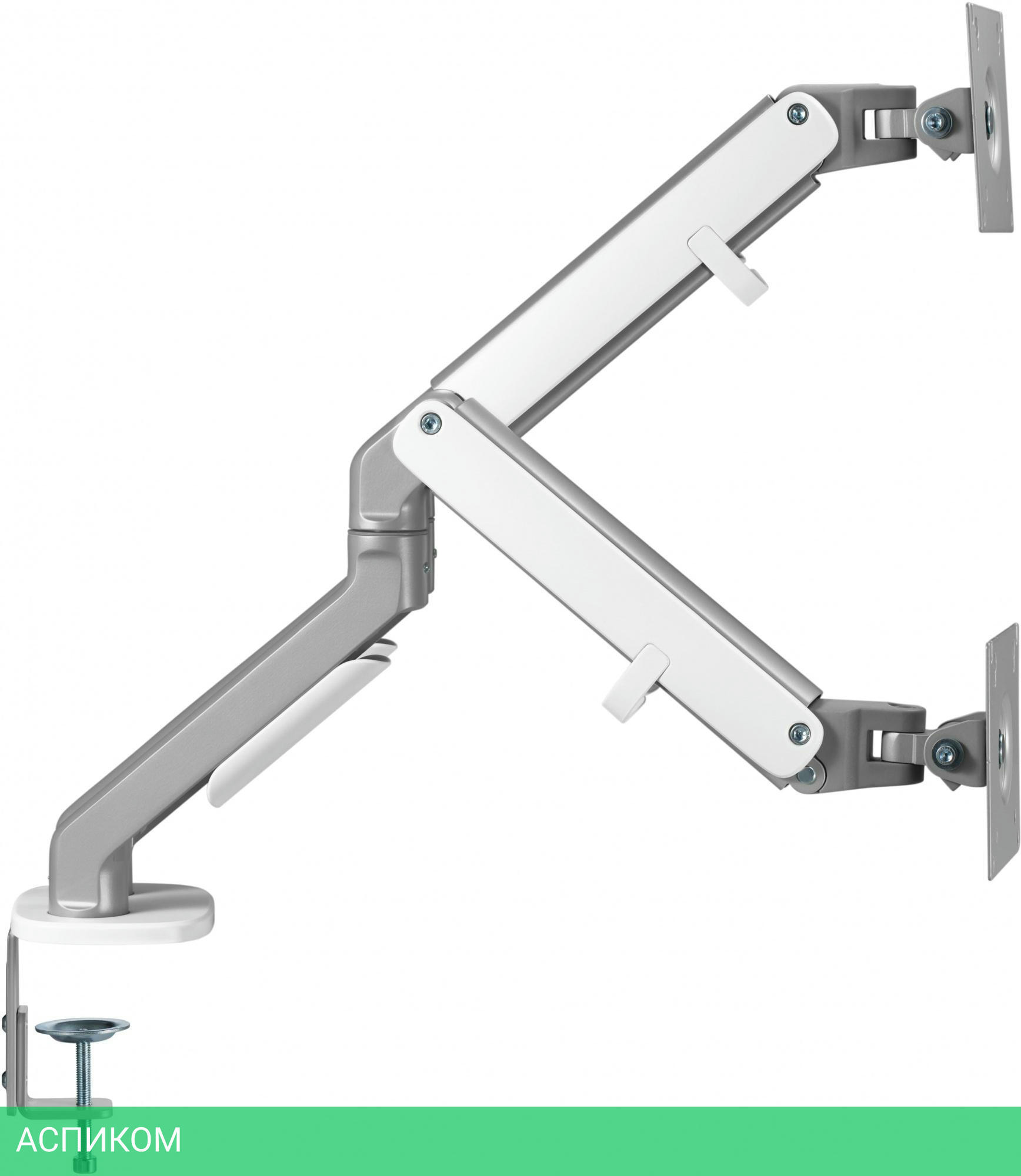 Настольный кронштейн с двумя креплениями под мониторы. Встроенный пружинный механизм натяжения поможет для идеальной регулировки веса.