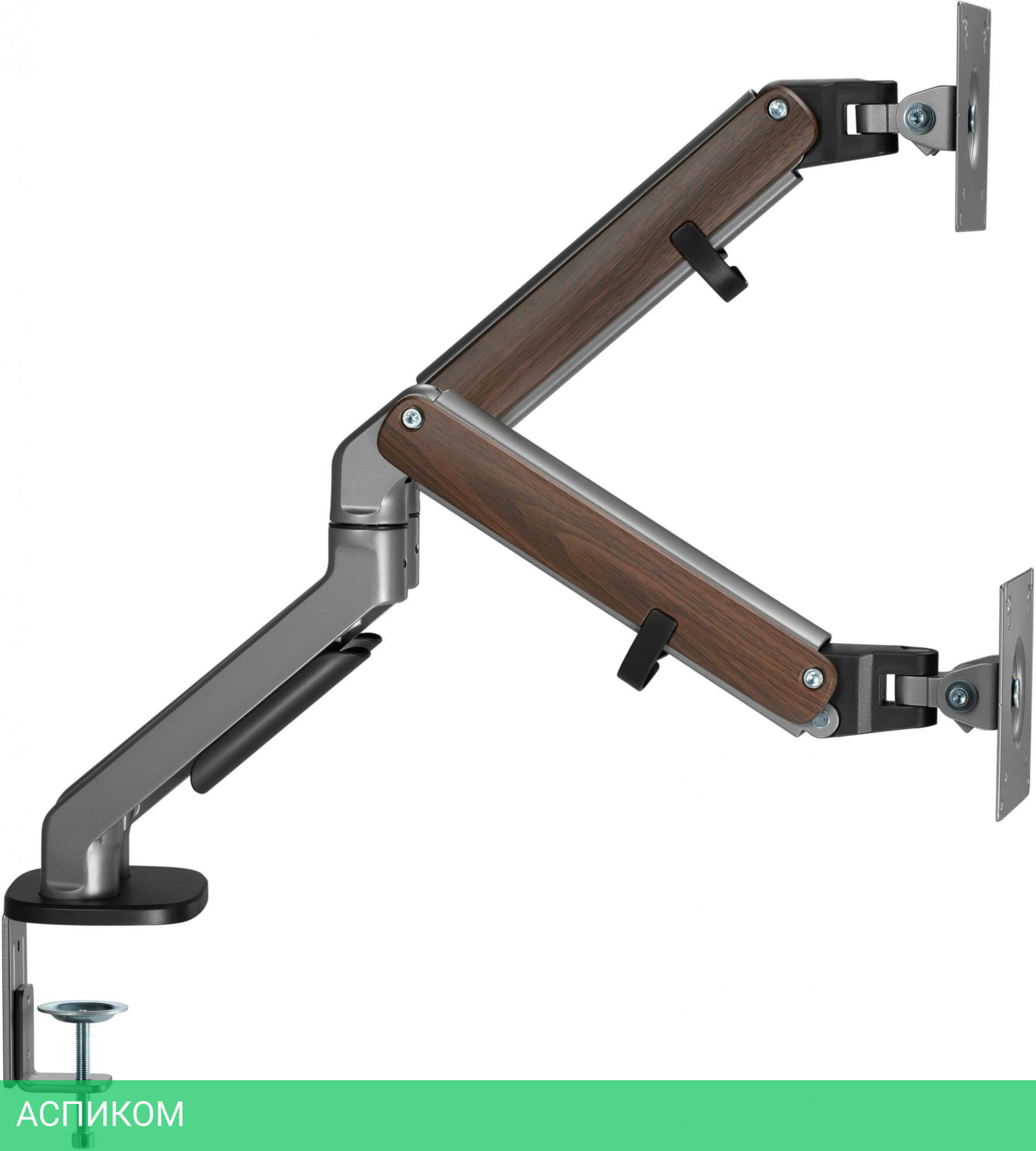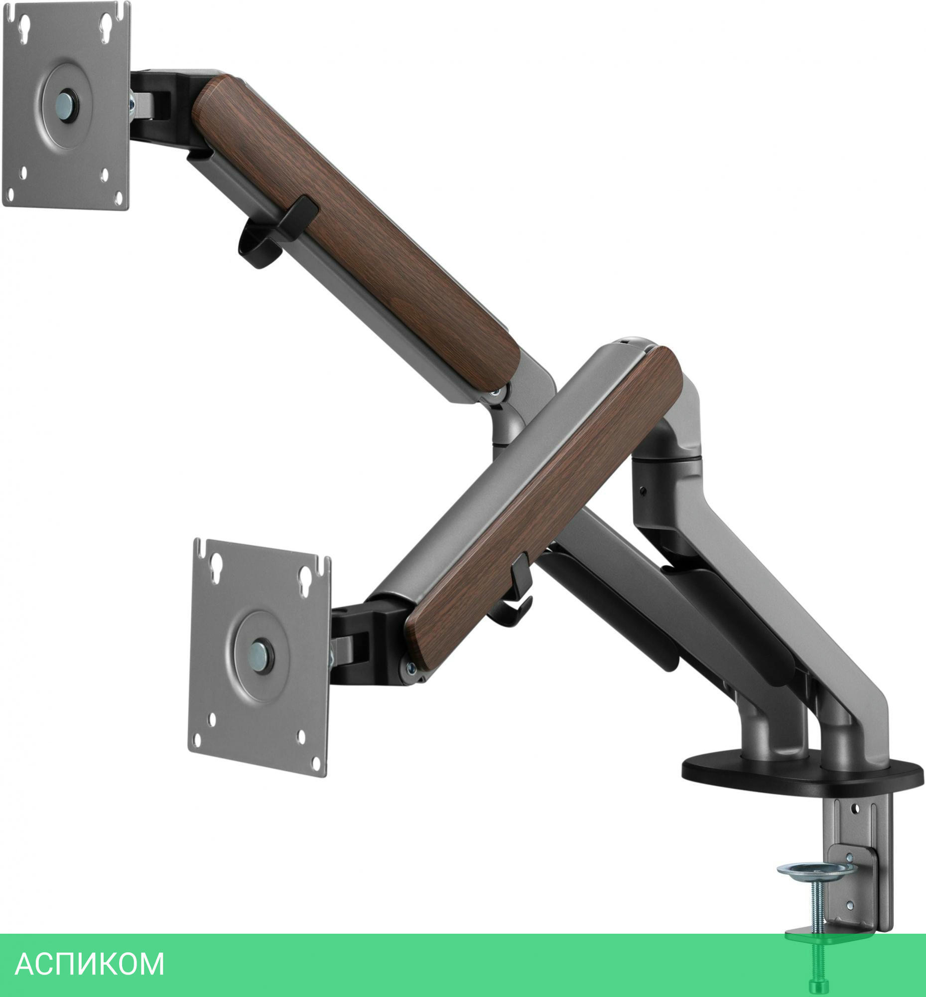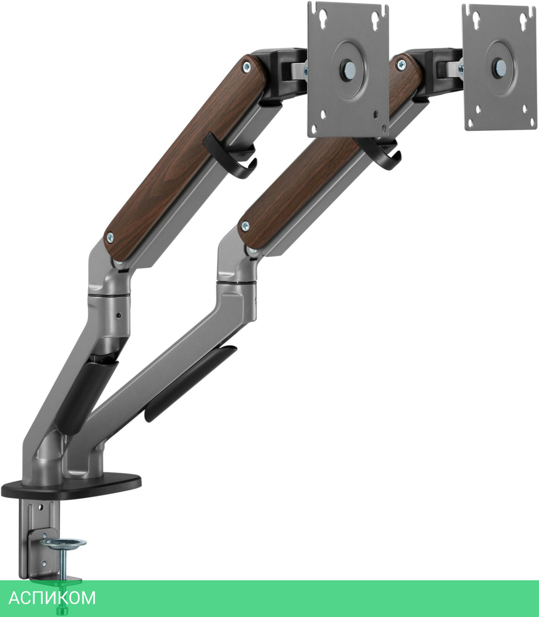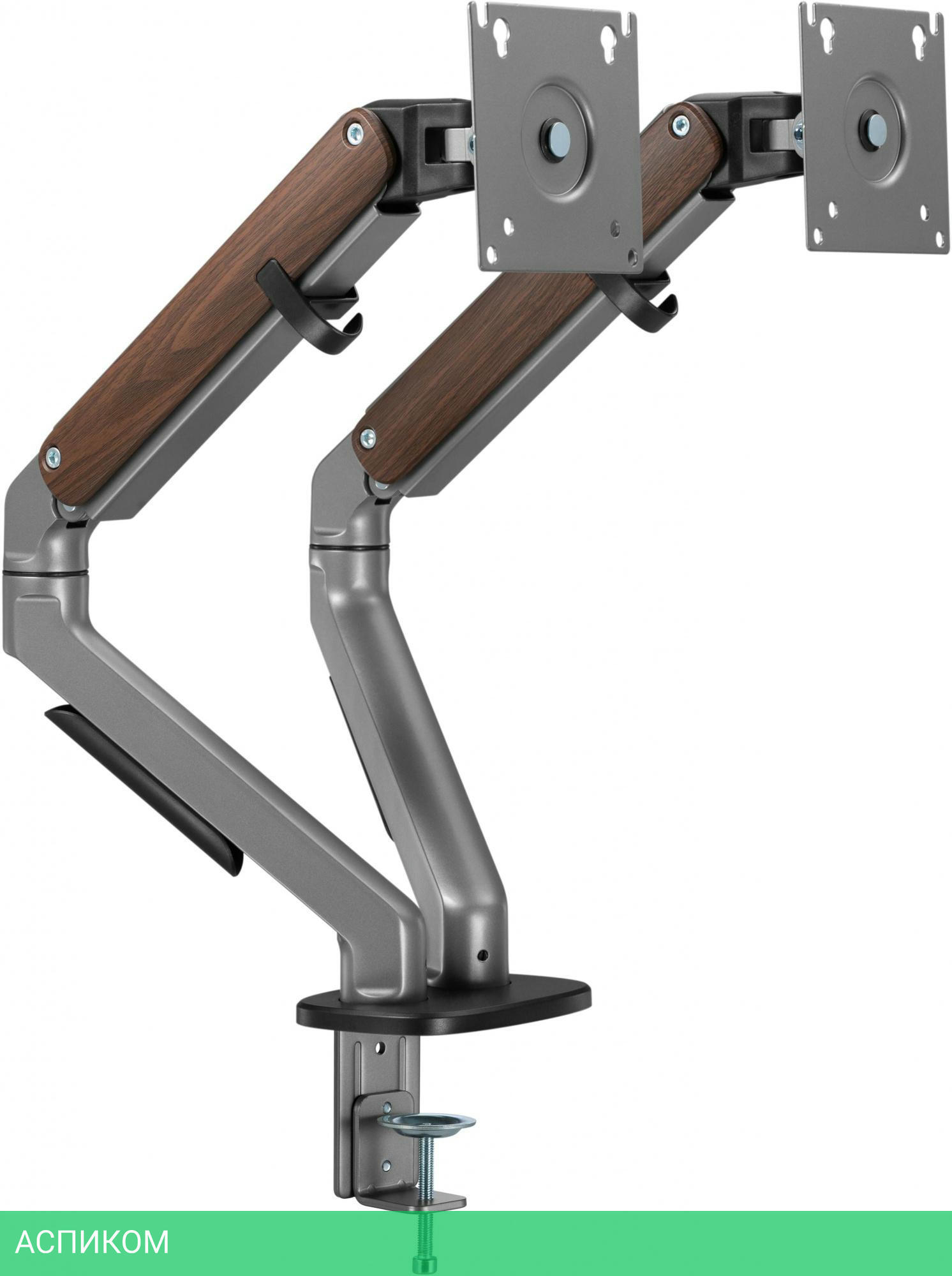 Настольный кронштейн с двумя креплениями под мониторы. Встроенный пружинный механизм натяжения поможет для идеальной регулировки веса.