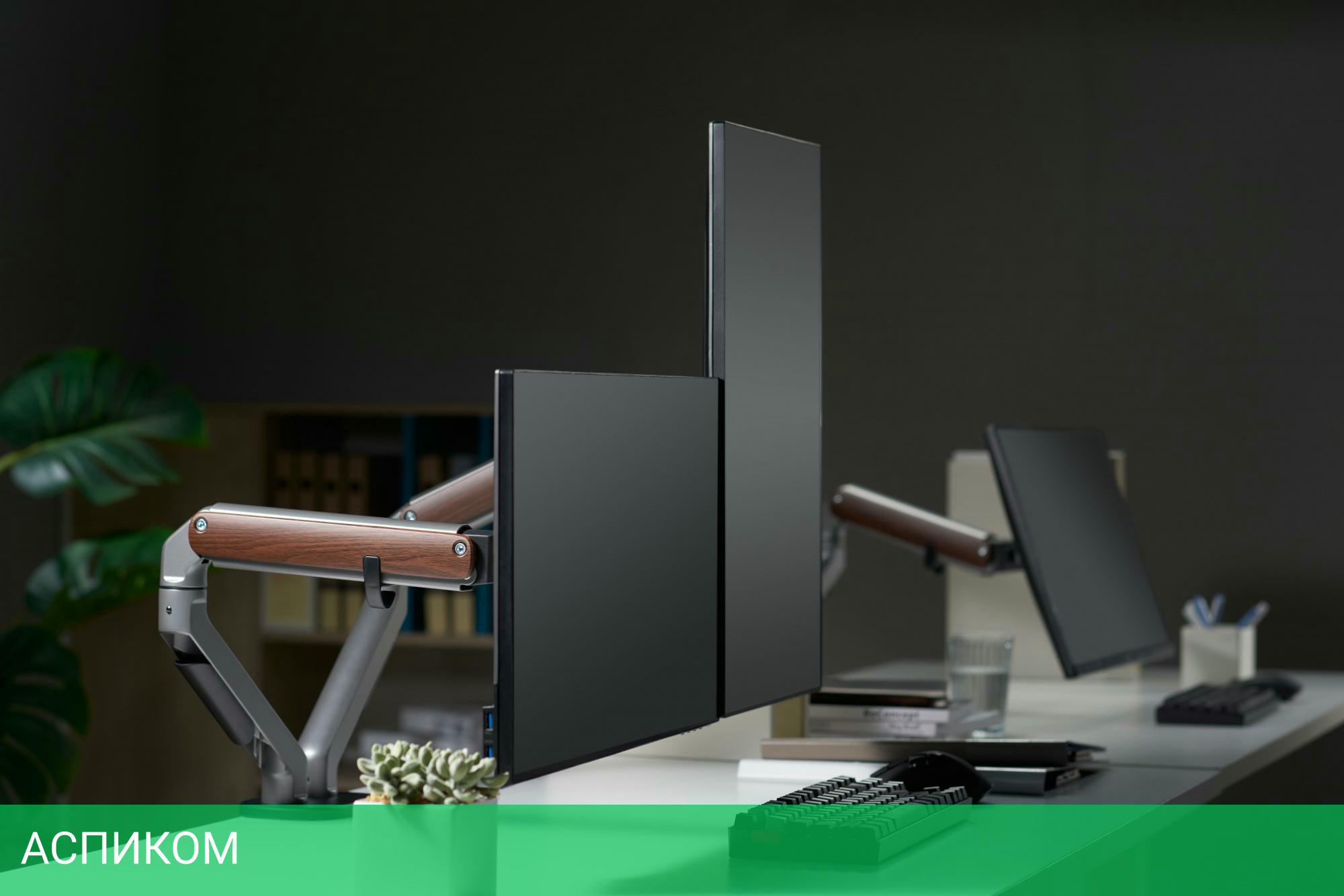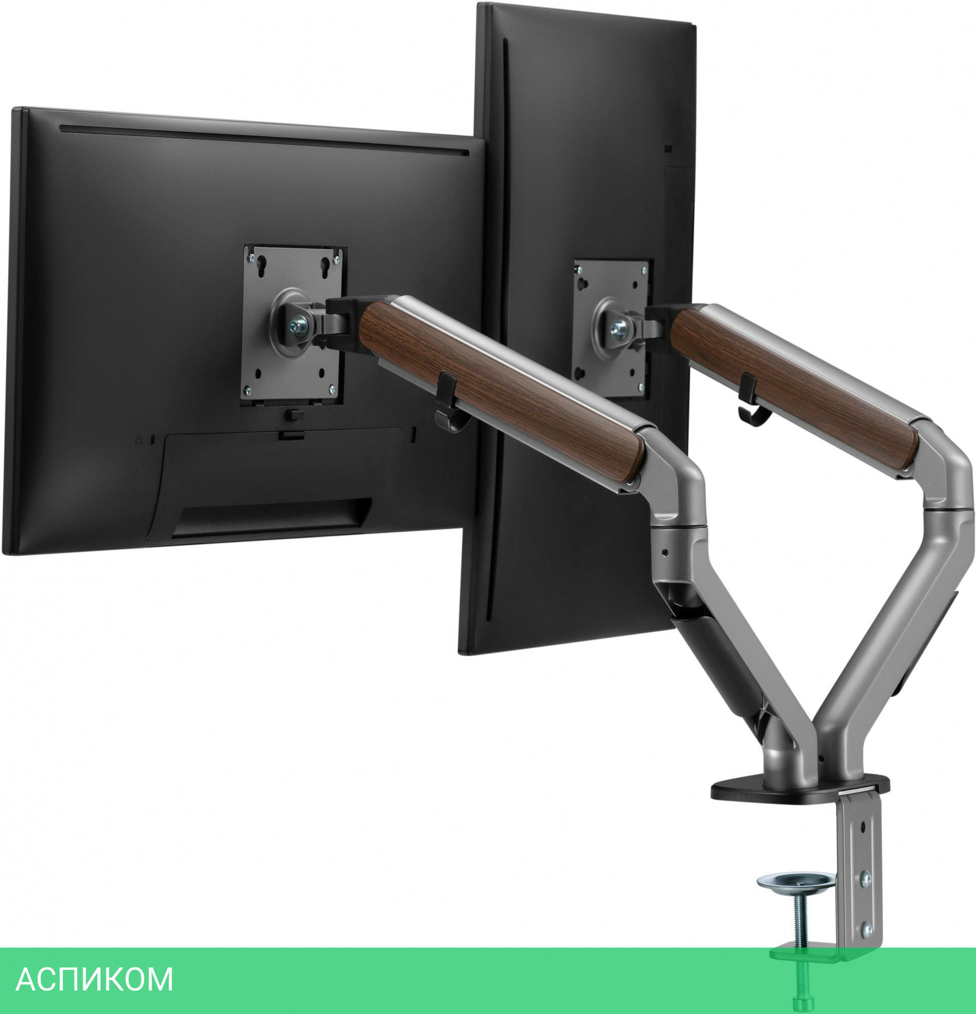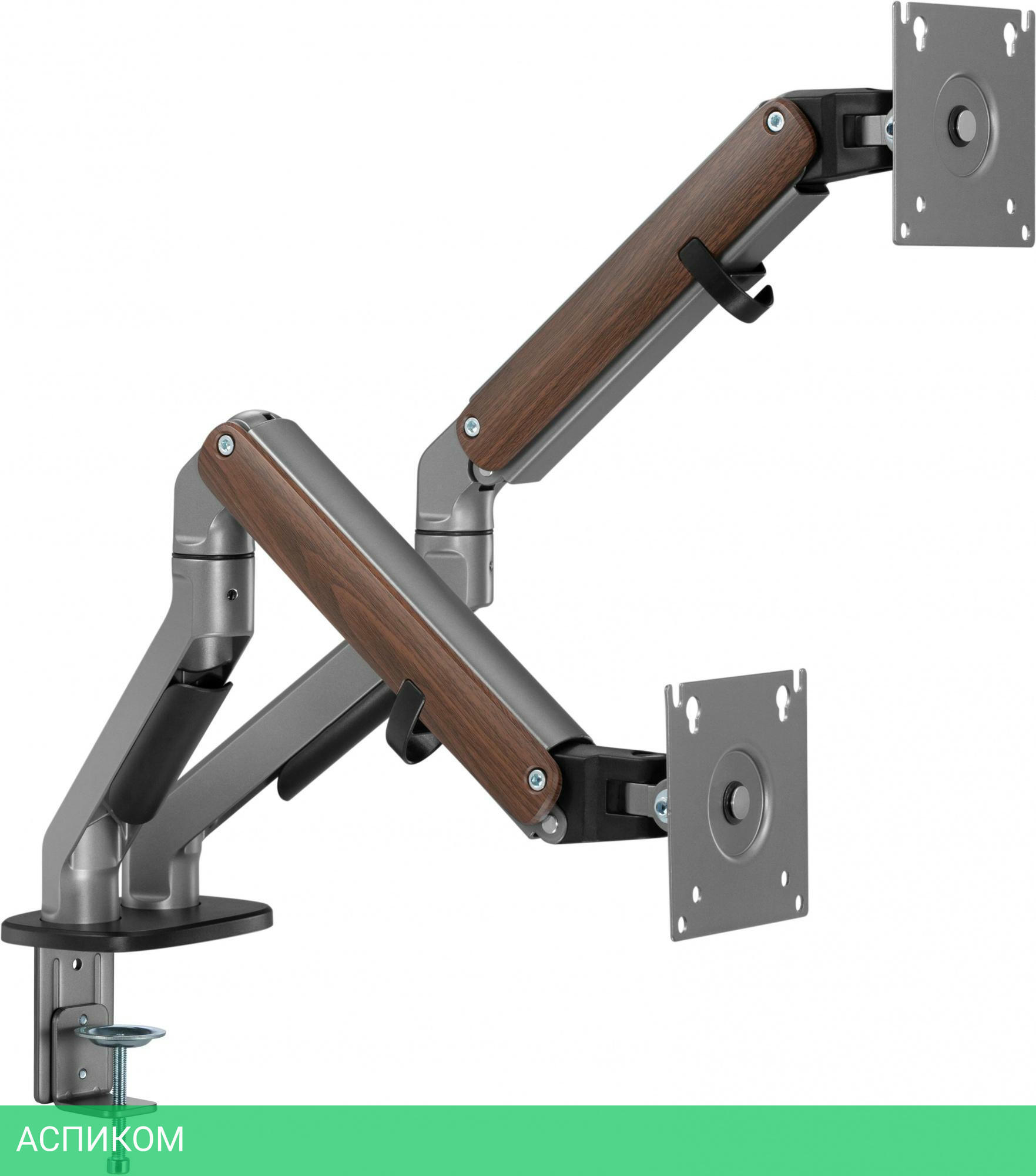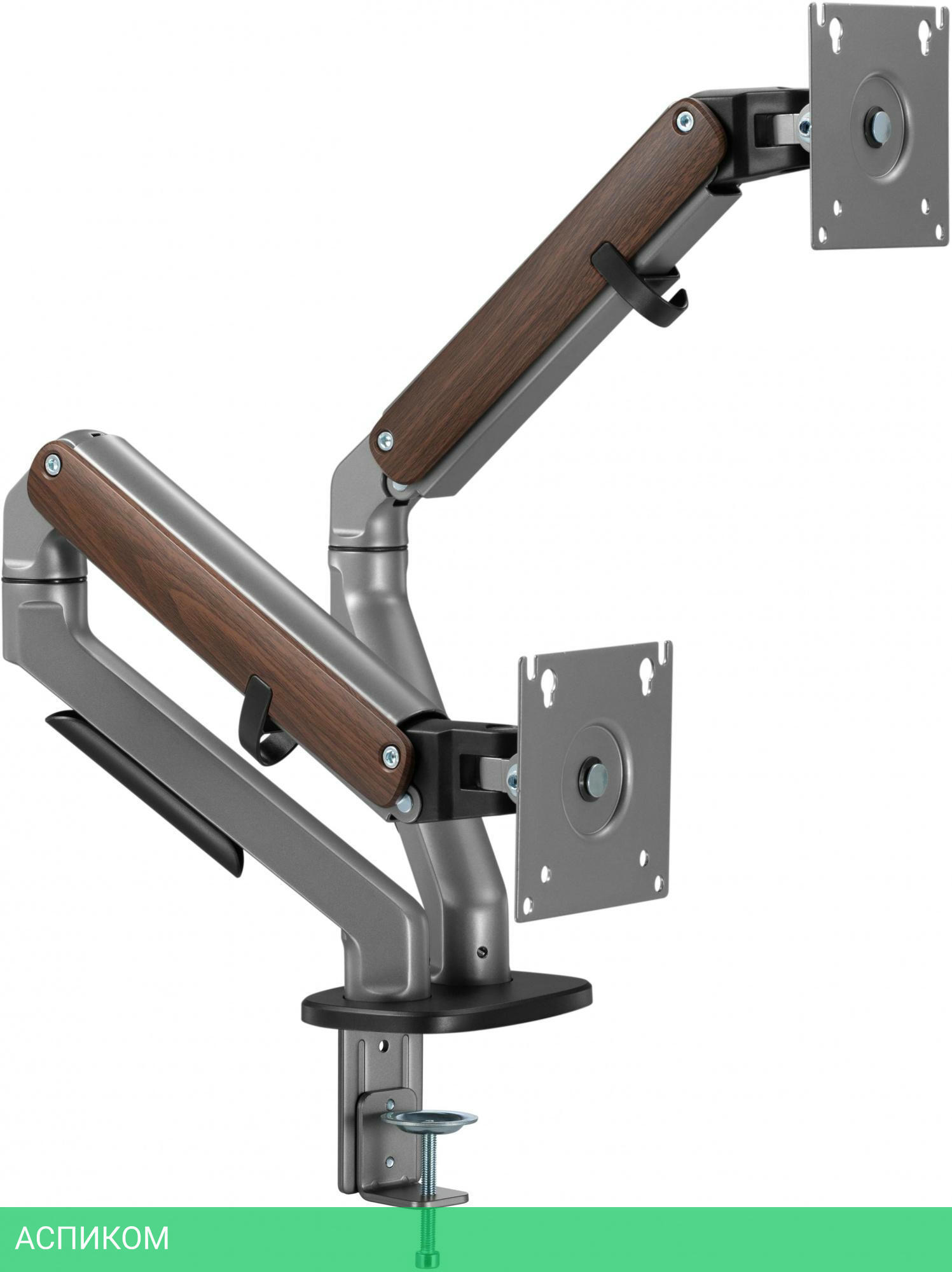 Настольный кронштейн с двумя креплениями под мониторы. Встроенный пружинный механизм натяжения поможет для идеальной регулировки веса.
