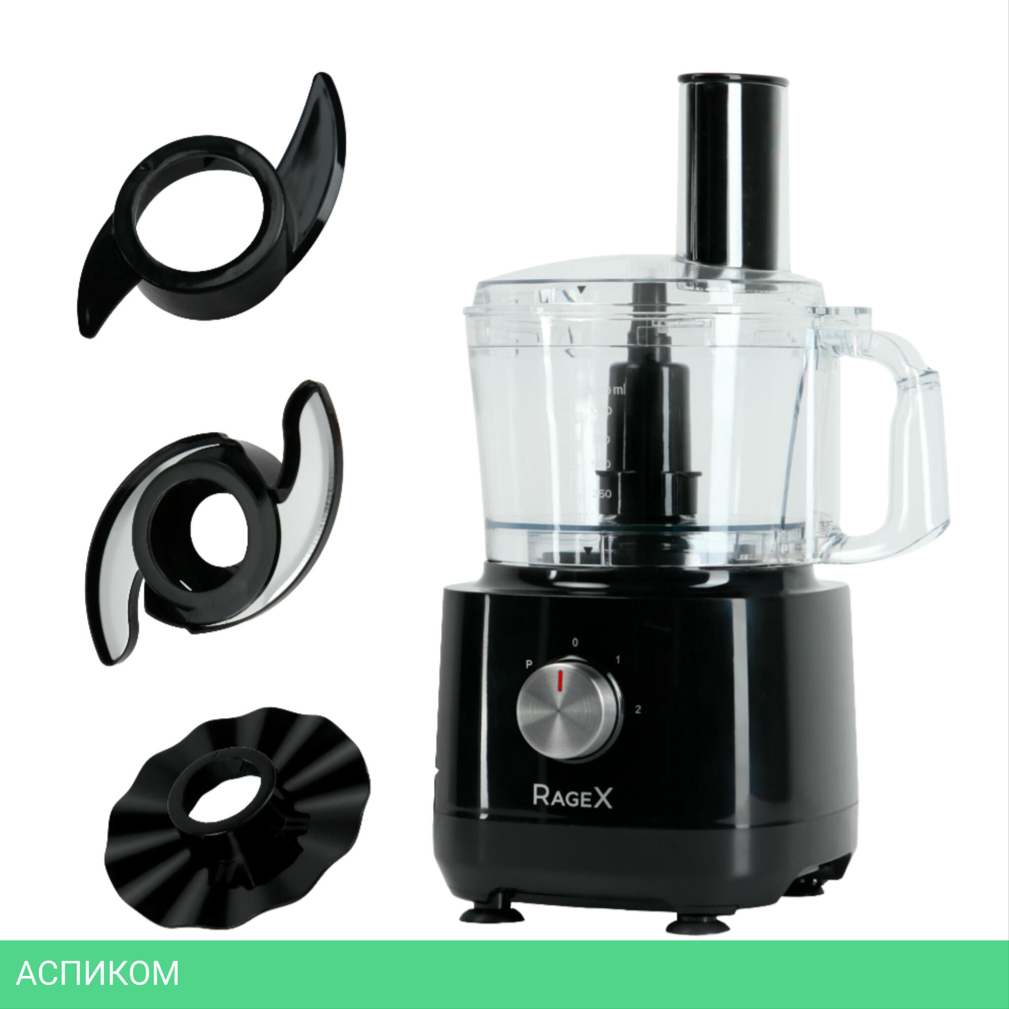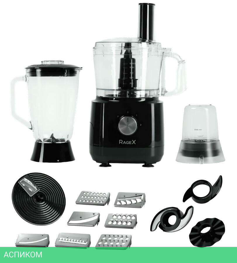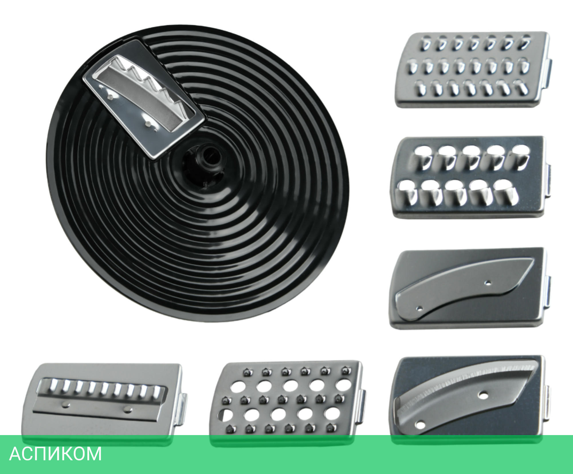 основание кухонного комбайна, чаша кухонного комбайна, толкатель, кофемолка, блендер с крышкой, диск эмульгатор, нож для измельчения;, нож для теста, пластиковая пластина для лезвий, лопатка, набор лезвий для нарезки – 7 шт (волнообразное лезвие, для нарезки тонких ломтиков, для нарезки толстых ломтиков, для нарезки картофеля фри, для нарезки тонкой соломки, для нарезки толстой соломки, для измельчения).