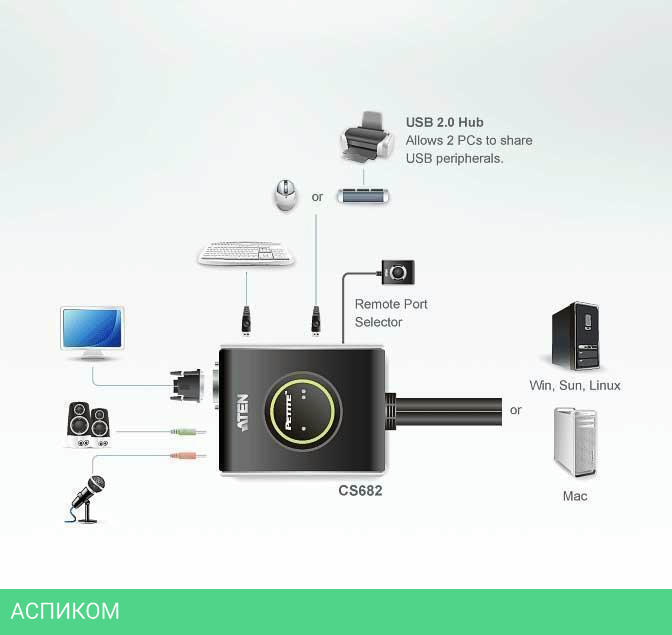 KVM переключатель / для компьютера; для av-аппаратуры / передача данных; передача видео; передача аудио / USB 2.0 Type-A; 3.5 мм jack