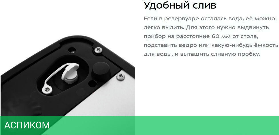 Если в резервуаре осталась вода, её можно легко вылить. Для этого нужно выдвинуть прибор на расстояние 60 мм от стола, подставить ведро или какую-нибудь ёмкость для воды, и вытащить сливную пробку.