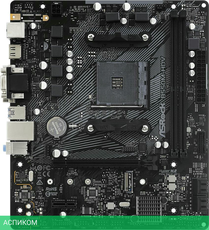 Материнская плата ASRock B550M-HDV DDR4/AM4/mATX/AMD B550/2xDDR4/4xSATA 3.0/1xM.2/Realtek ALC887/3x3.5 мм jack/RAID/1xHDMI/1xVGA (D-Sub)/1xDVI-D/1xCOM (внутр.)/1xPS/2