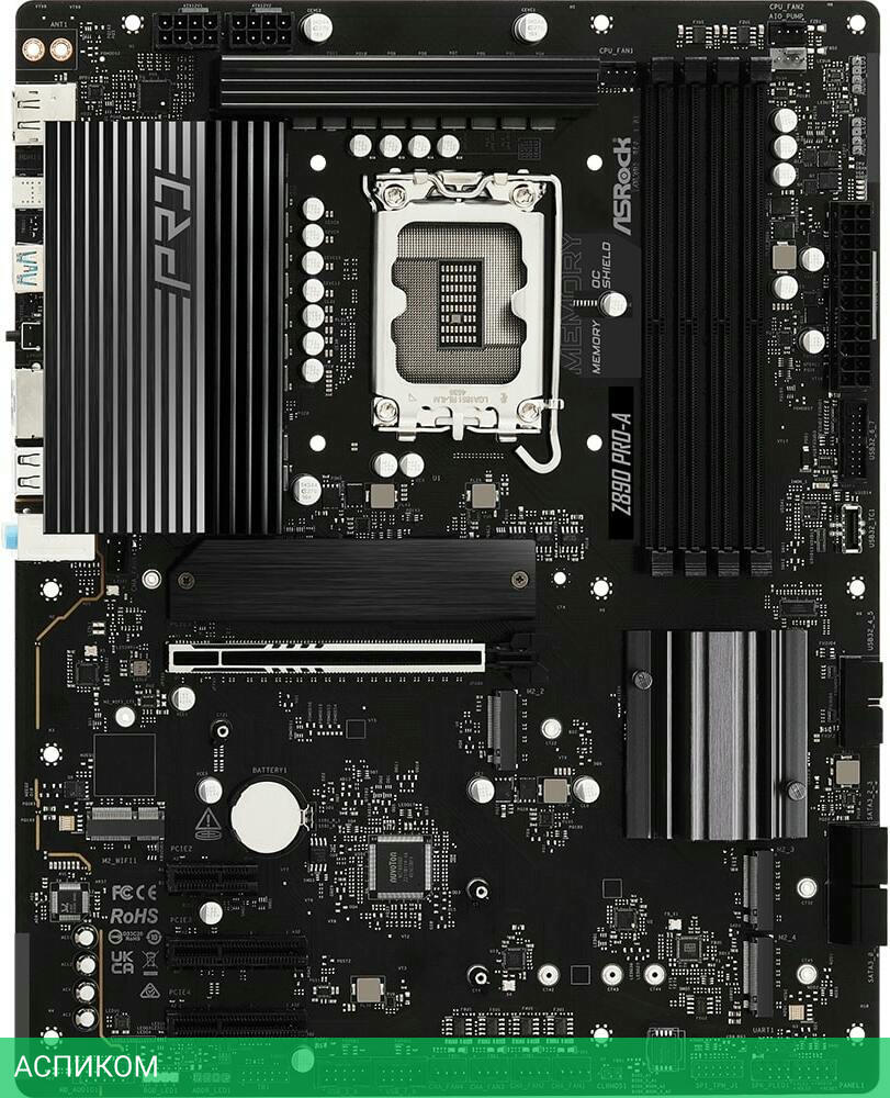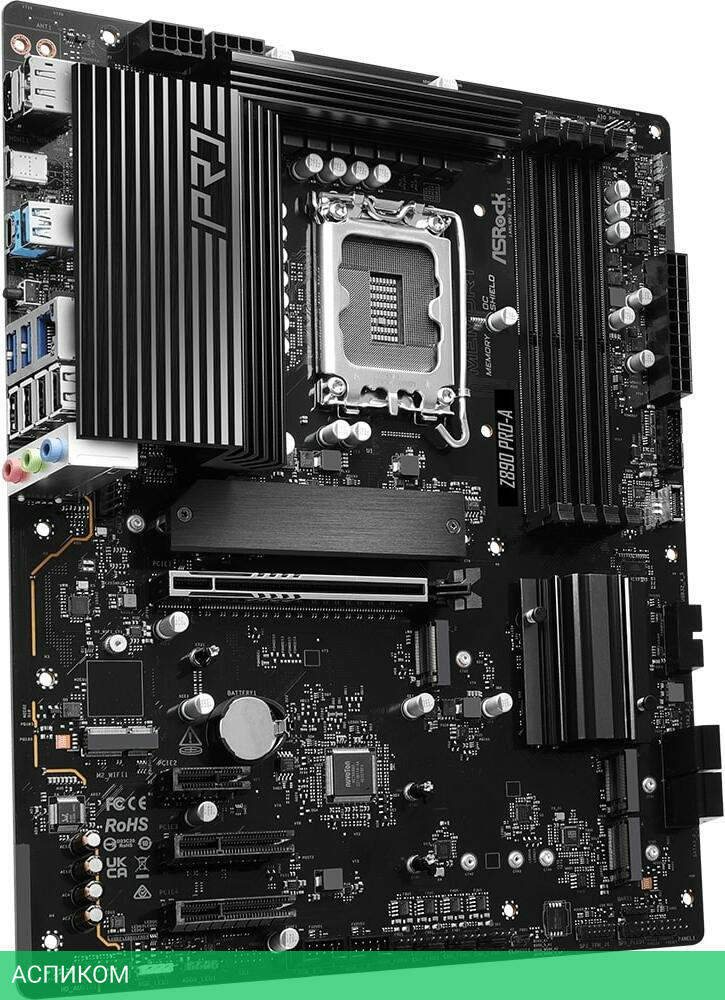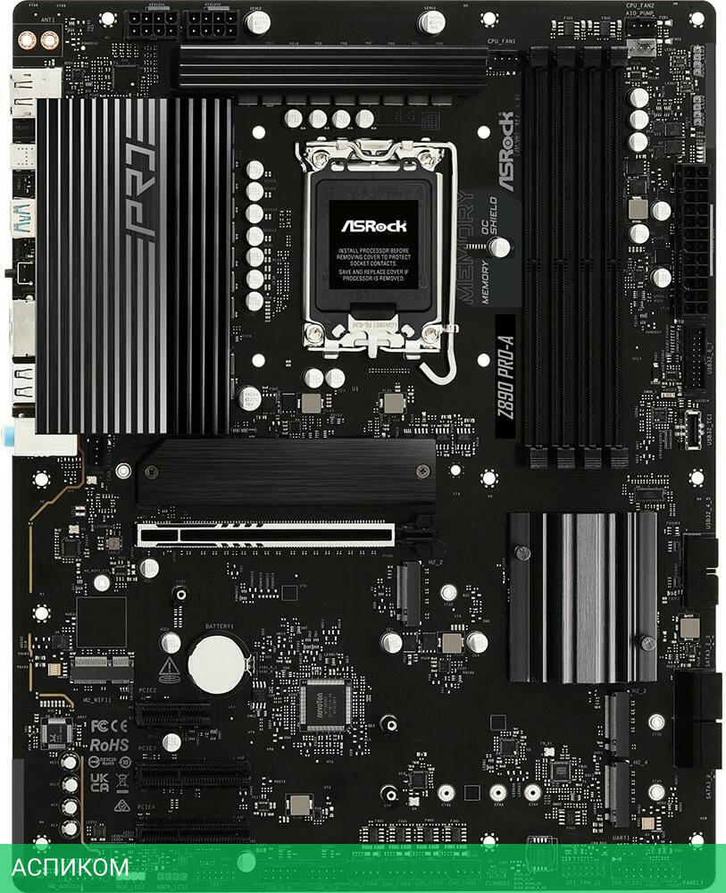 Материнская плата ASRock Z890 Pro-A/LGA1851/ATX/Intel Z890/4xDDR5/4xSATA 3.0/4xM.2/Realtek ALC897/8 каналов (7.1)/3x3.5 мм jack/1xDP/1x2.5 Gigabit/RAID/4x USB 2.0 (+4 внутренних)/2x USB 3.2 Gen1 Type-A (+4 внутренних)/1x USB 3.2 Gen2 Type-A/1x USB 3.2 Gen 2x2 (+1 внутренний)/1x USB-C (Thunderbolt 4)/1x PCIe x16 (1x PCIe 5.0 x16)/1x PCIe x1 (1x PCIe 4.0 x1)/2x PCIe x4 (2x PCIe 4.0 x4)/1xHDMI/1хWIFI slot