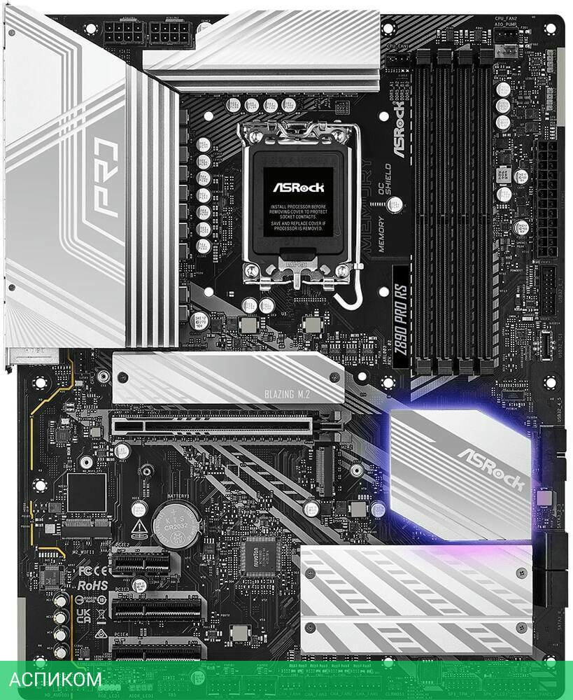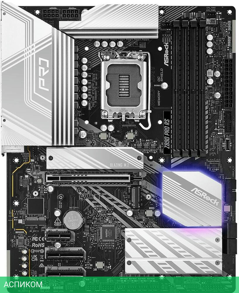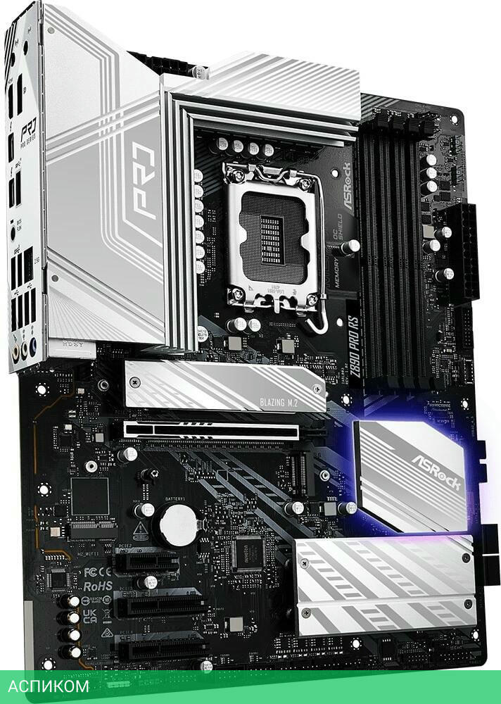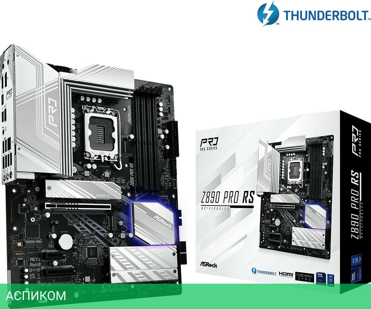 Материнская плата ASRock Z890 Pro RS/LGA1851/ATX/Intel Z890/4xDDR5/4xSATA 3.0/4xM.2/Realtek ALC897/8 каналов (7.1)/3x3.5 мм jack/1xDP/1x2.5 Gigabit/RAID/4x USB 2.0 (+4 внутренних)/2x USB 3.2 Gen1 Type-A (+4 внутренних)/1x USB 3.2 Gen2 Type-A/1x USB 3.2 Gen 2x2 (внутренних)/2x USB-C (Thunderbolt 4)/1x PCIe x16 (1x PCIe 5.0 x16)/1x PCIe x1 (1x PCIe 4.0 x1)/2x PCIe x4 (2x PCIe 4.0 x4)/1xHDMI/1хWIFI slot