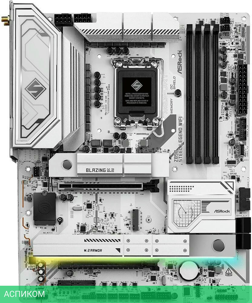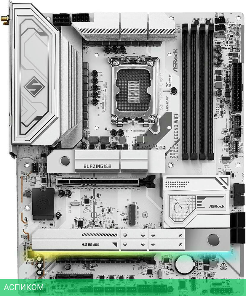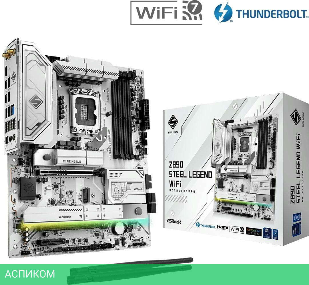 Материнская плата ASRock Z890 Steel Legend WiFi/LGA1851/ATX/Intel Z890/4xDDR5/4xSATA 3.0/4xM.2/Realtek ALC1220/8 каналов (7.1)/2x3.5 мм jack/1x2.5 Gigabit/RAID/2x USB 2.0 (+4 внутренних)/4x USB 3.2 Gen1 Type-A (+4 внутренних)/2x USB 3.2 Gen2 Type-A/1x USB 3.2 Gen 2x2 (внутренних)/2x USB-C (Thunderbolt 4)/2x PCIe x16 (1x PCIe 5.0 x16, 1x PCIe 4.0 x4)/1x PCIe x4 (1x PCIe 4.0 x4)/1xHDMI/BT, WiFi/1хWIFI slot