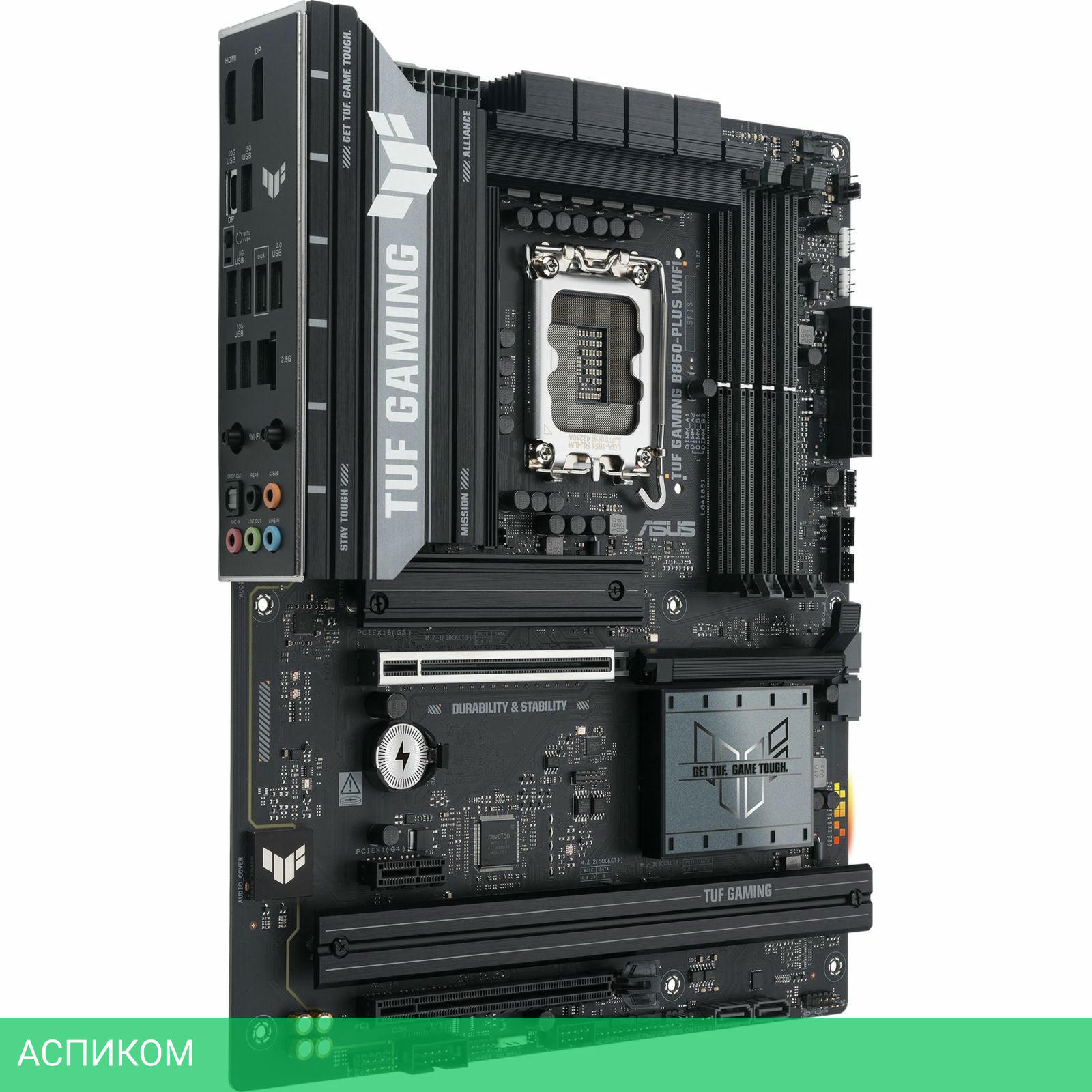 Материнская плата Asus TUF Gaming B860-Plus WIFI (90MB1JL0-M0EAY0)/LGA1851/ATX/Intel B860/4xDDR5, DDR5 CUDIMM/4xSATA 3.0/3xM.2/8 каналов (7.1)/5x3.5 мм jack/1x2.5 Gigabit/RAID/2x USB 2.0 (+1 внутренних)/2x USB 3.2 Gen1 Type-A (+1 внутренних)/2x USB 3.2 Gen2 Type-A/1x USB 3.2 Gen2 Type-C (внутренних)/1x USB 3.2 Gen 2x2/2x PCIe x16/1x PCIe x1/1xHDMI/BT, WiFi/1xCOM (внутр.)