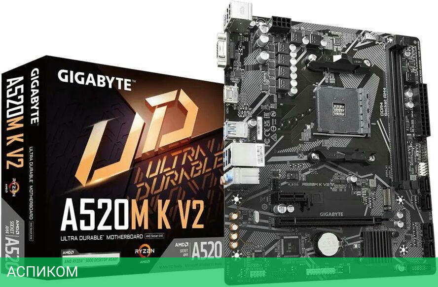 Материнская плата GigaByte A520M K V2 DDR4/AM4/mATX/AMD A520/2xDDR4/4xSATA 3.0/1xM.2/8 каналов (7.1)/3x3.5 мм jack/1x1 Gigabit/RAID/2x USB 2.0 (+4 внутренних)/4x USB 3.2 Gen1 Type-A (+1 внутренних)/1x PCIe x16 (1x PCIe 3.0 x16)/1x PCIe x1 (1x PCIe 3.0 x1)/1xHDMI/1xVGA (D-Sub)/1xPS/2