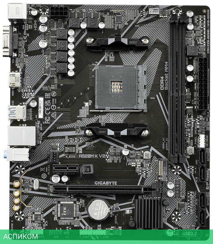 Материнская плата GigaByte A520M K V2 DDR4 rev.1.1/AM4/mATX/AMD A520/2xDDR4/4xSATA 3.0/1xM.2/8 каналов (7.1)/3x3.5 мм jack/1x1 Gigabit/RAID/2x USB 2.0 (+4 внутренних)/4x USB 3.2 Gen1 Type-A (+2 внутренних)/1x PCIe x16 (1x PCIe 3.0 x16)/1x PCIe x1 (1x PCIe 3.0 x1)/1xHDMI/1xVGA (D-Sub)/1xPS/2