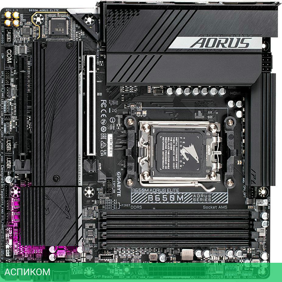 Материнская плата GigaByte B650M Aorus Elite DDR5/AM5/mATX/AMD B650/4xDDR5/4xSATA 3.0/2xM.2/8 каналов (7.1)/2x3.5 мм jack/1xDP/1x2.5 Gigabit/RAID/4x USB 2.0/2x USB 3.2 Gen2 Type-A/1x USB 3.2 Gen2 Type-C/2x PCIe x16/1xHDMI