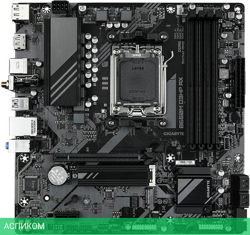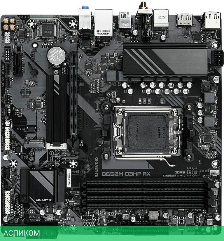 Материнская плата GigaByte B650M D3HP AX rev. 1.2/AM5/mATX/AMD B650/4xDDR5/4xSATA 3.0/2xM.2/8 каналов (7.1)/3x3.5 мм jack/2xDP/1x2.5 Gigabit/RAID/2x USB 2.0 (+4 внутренних)/3x USB 3.2 Gen1 Type-A (+2 внутренних)/1x USB 3.2 Gen1 Type-C (+ 1 внутренних)/1x PCIe x16 (1x PCIe 4.0 x16)/1x PCIe x1 (1x PCIe 3.0 x1)/1xHDMI/BT, WiFi/1xPS/2