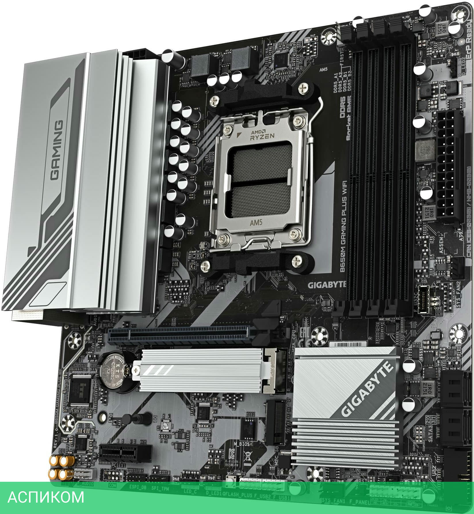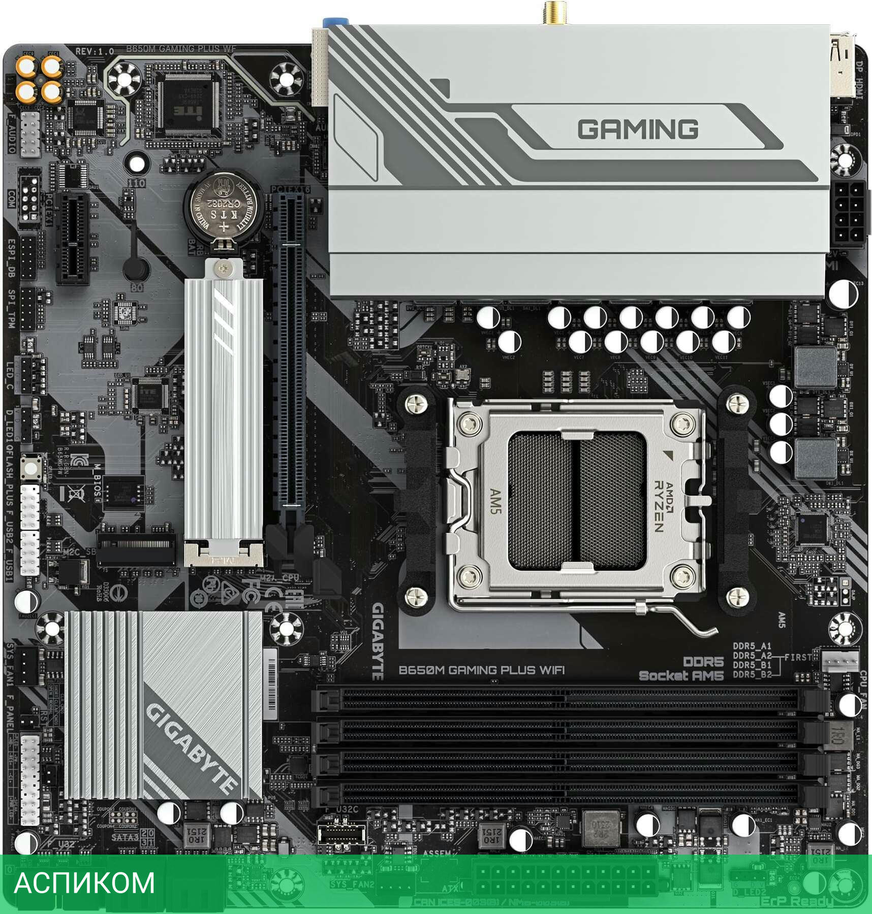 Материнская плата Gigabyte B650M Gaming Plus WIFI rev. 1.2/AM5/mATX/AMD B650/4xDDR5/4xSATA 3.0/2xM.2/8 каналов (7.1)/3x3.5 мм jack/2xDP/1x2.5 Gigabit/RAID/2x USB 2.0 (+4 внутренних)/3x USB 3.2 Gen1 Type-A (+2 внутренних)/1x USB 3.2 Gen1 Type-C (+ 1 внутренних)/1x PCIe x16 (1x PCIe 4.0 x16)/1x PCIe x1 (1x PCIe 3.0 x1)/1xHDMI/BT, WiFi/1xPS/2