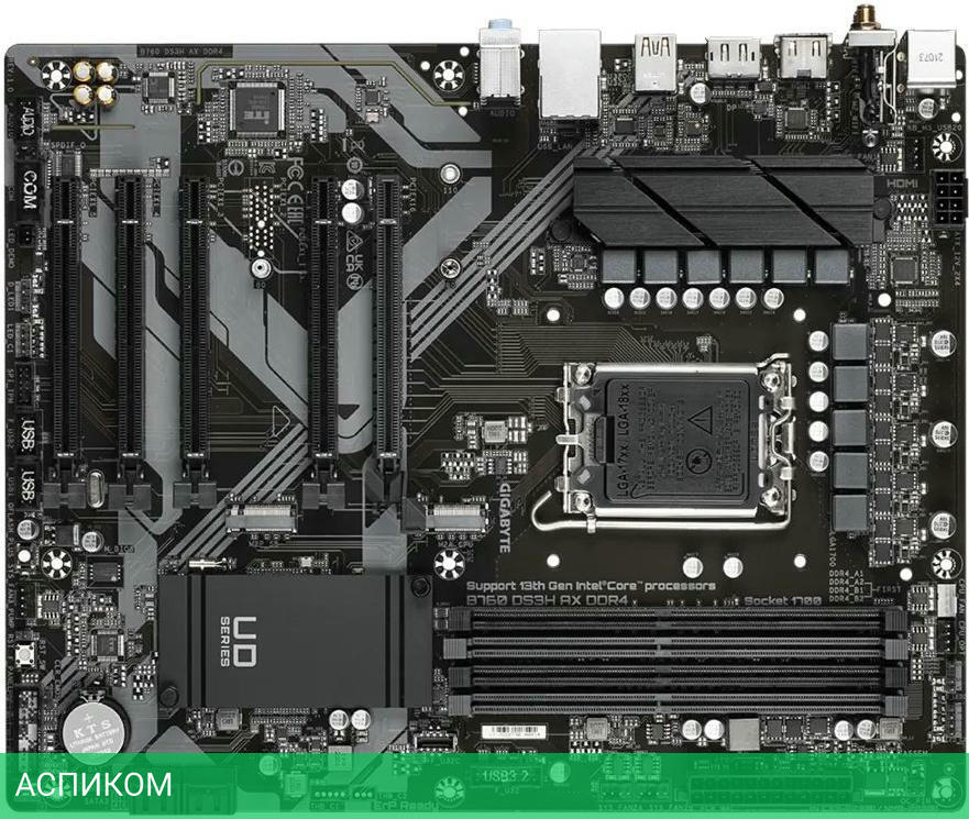 Материнская плата GigaByte B760 DS3H AX DDR4 (rev. 1.x)/LGA1700/ATX/Intel B760/4xDDR4/4xSATA 3.0/2xM.2/8 каналов (7.1)/3x3.5 мм jack/1xDP/1x1 Gigabit/RAID/4x USB 2.0 (+4 внутренних)/2x USB 3.2 Gen1 Type-A (внутренних)/1x USB 3.2 Gen2 Type-A/1x USB 3.2 Gen1 Type-C/1x USB 3.2 Gen 2x2/5x PCIe x16 (1x PCIe 4.0 x16, 4x PCIe 3.0 x1)/1xHDMI/BT, WiFi/1хWIFI slot/1xCOM (внутр.)