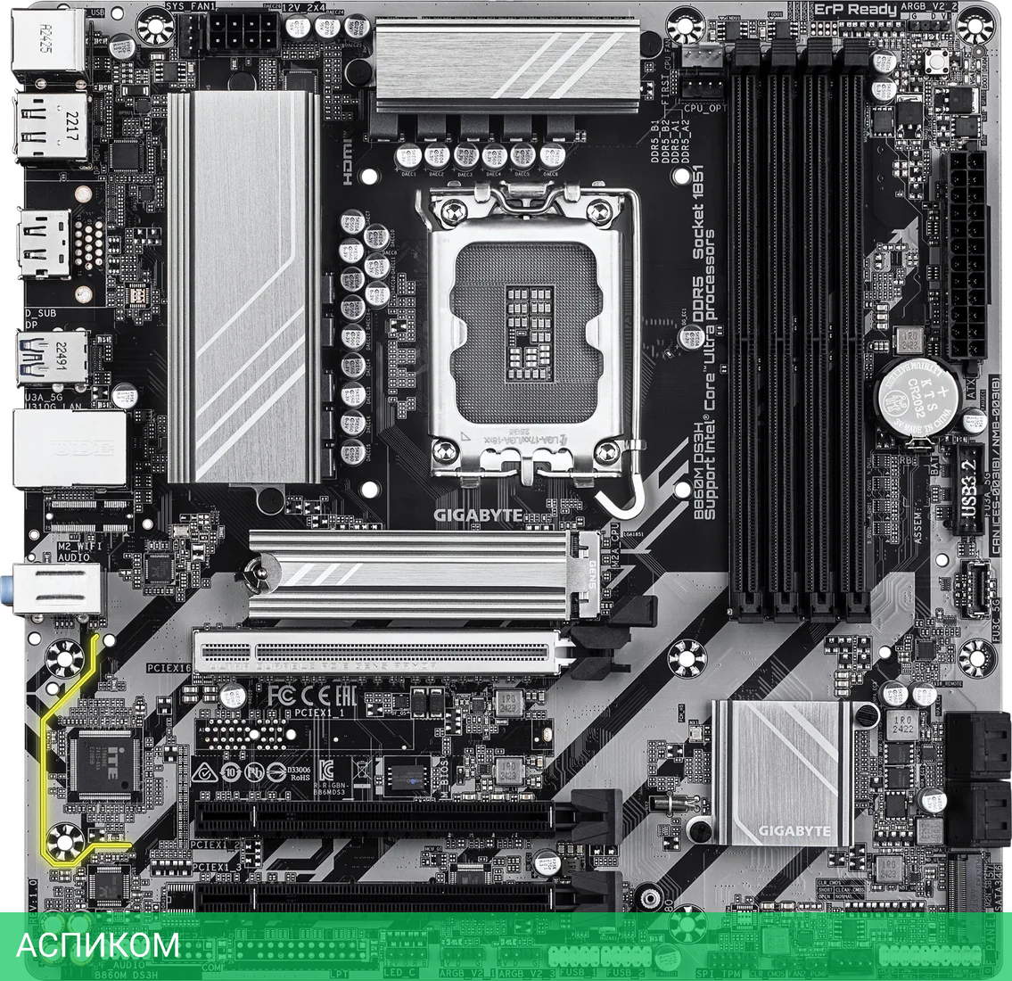 Материнская плата Gigabyte B860M DS3H rev. 1.0/LGA1851/mATX/Intel B860/4xDDR5/4xSATA 3.0/2xM.2/8 каналов (7.1)/3x3.5 мм jack/2xDP/1x2.5 Gigabit/RAID/3x USB 2.0 (+2 внутренних)/2x USB 3.2 Gen1 Type-A (+1 внутренних)/1x USB 3.2 Gen2 Type-A/1x USB 3.2 Gen1 Type-C (внутренних)/3x PCIe x16/1xHDMI/1xPS/2