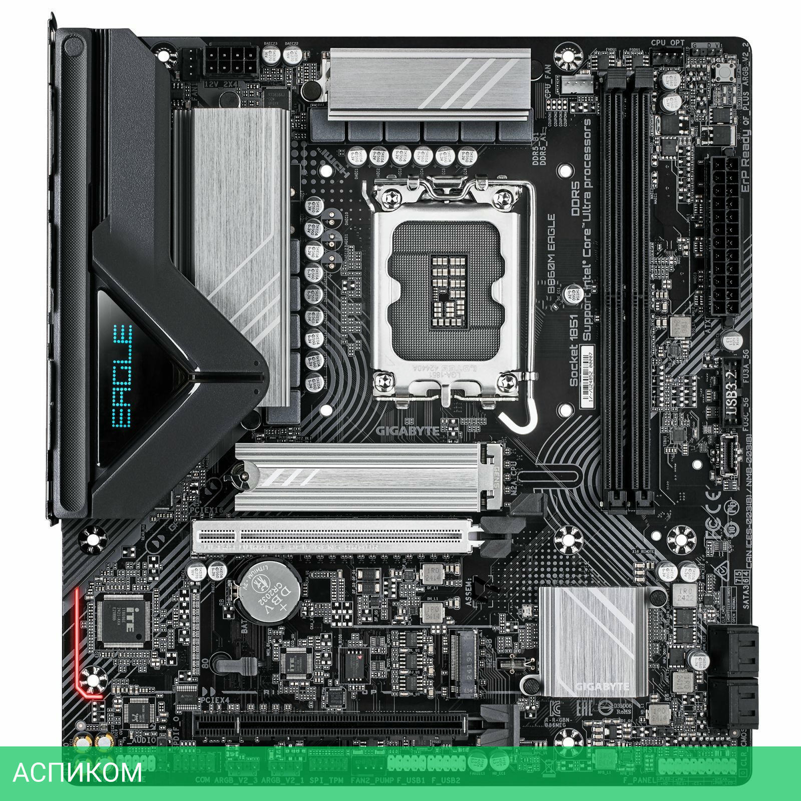Материнская плата Gigabyte B860M Eagle rev. 1.0/LGA1851/mATX/Intel B860/2xDDR5/4xSATA 3.0/2xM.2/8 каналов (7.1)/3x3.5 мм jack/1xDP/1x2.5 Gigabit/RAID/3x USB 2.0 (+2 внутренних)/2x USB 3.2 Gen1 Type-A (+1 внутренних)/1x USB 3.2 Gen1 Type-C (внутренних)/2x PCIe x16/1xHDMI/1xCOM (внутр.)/1xPS/2