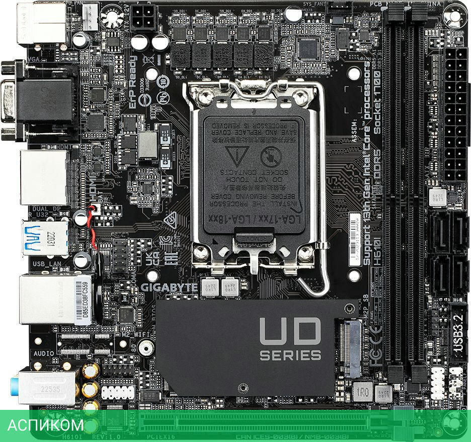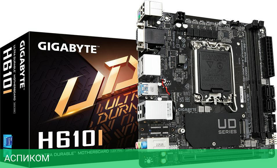 Материнская плата Gigabyte H610I DDR5 rev. 1.0/LGA1700/Mini-ITX/Intel H610/2xDDR5/4xSATA 3.0/1xM.2/8 каналов (7.1)/3x3.5 мм jack/2xDP/1x2.5 Gigabit/4x USB 2.0 (+1 внутренний)/2x USB 3.2 Gen1 Type-A (+1 внутренних)/1x PCIe x16/1xHDMI/1xVGA (D-Sub)/1xCOM (внутр.)/1xPS/2