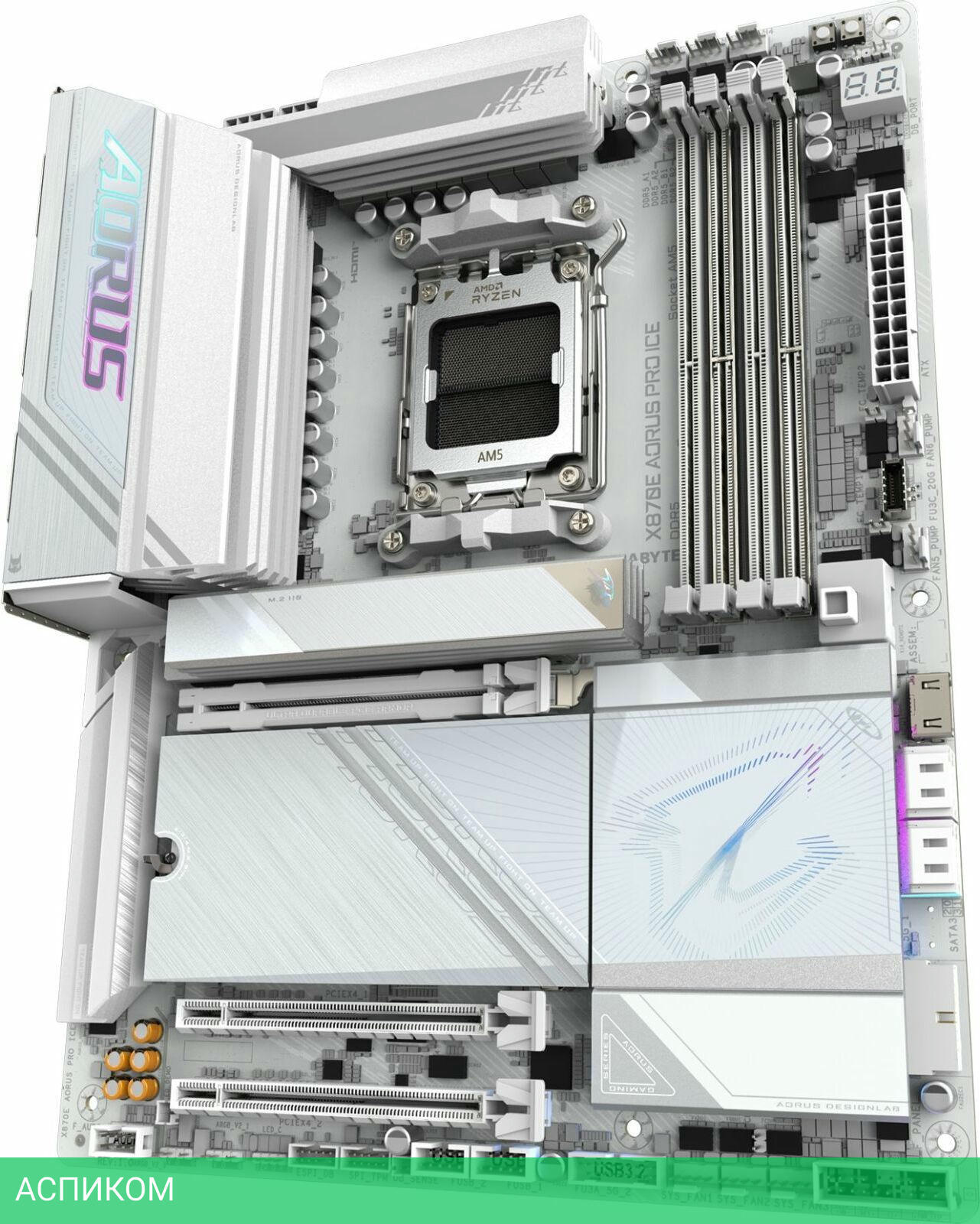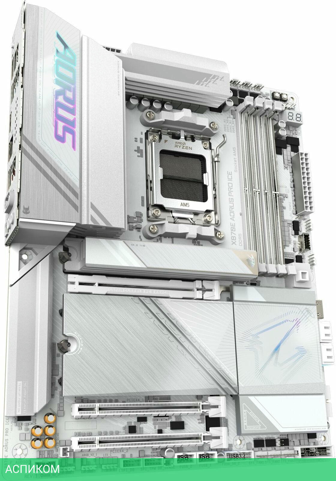 Материнская плата GigaByte X870E Aorus Pro Ice/AM5/ATX/AMD X870E/4xDDR5/4xSATA 3.0/4xM.2/Realtek ALC1220/8 каналов (7.1)/2x3.5 мм jack/1x2.5 Gigabit/RAID/6x USB 2.0 (+2 внутренних)/4x USB 3.2 Gen1 Type-A/3x USB 3.2 Gen2 Type-A/1x USB 3.2 Gen 2x2/2x USB4/2x PCIe x16 (1x PCIe 4.0 x16, 1x PCIe 3.0 x4)/2xHDMI/BT, WiFi/2хWIFI slot
