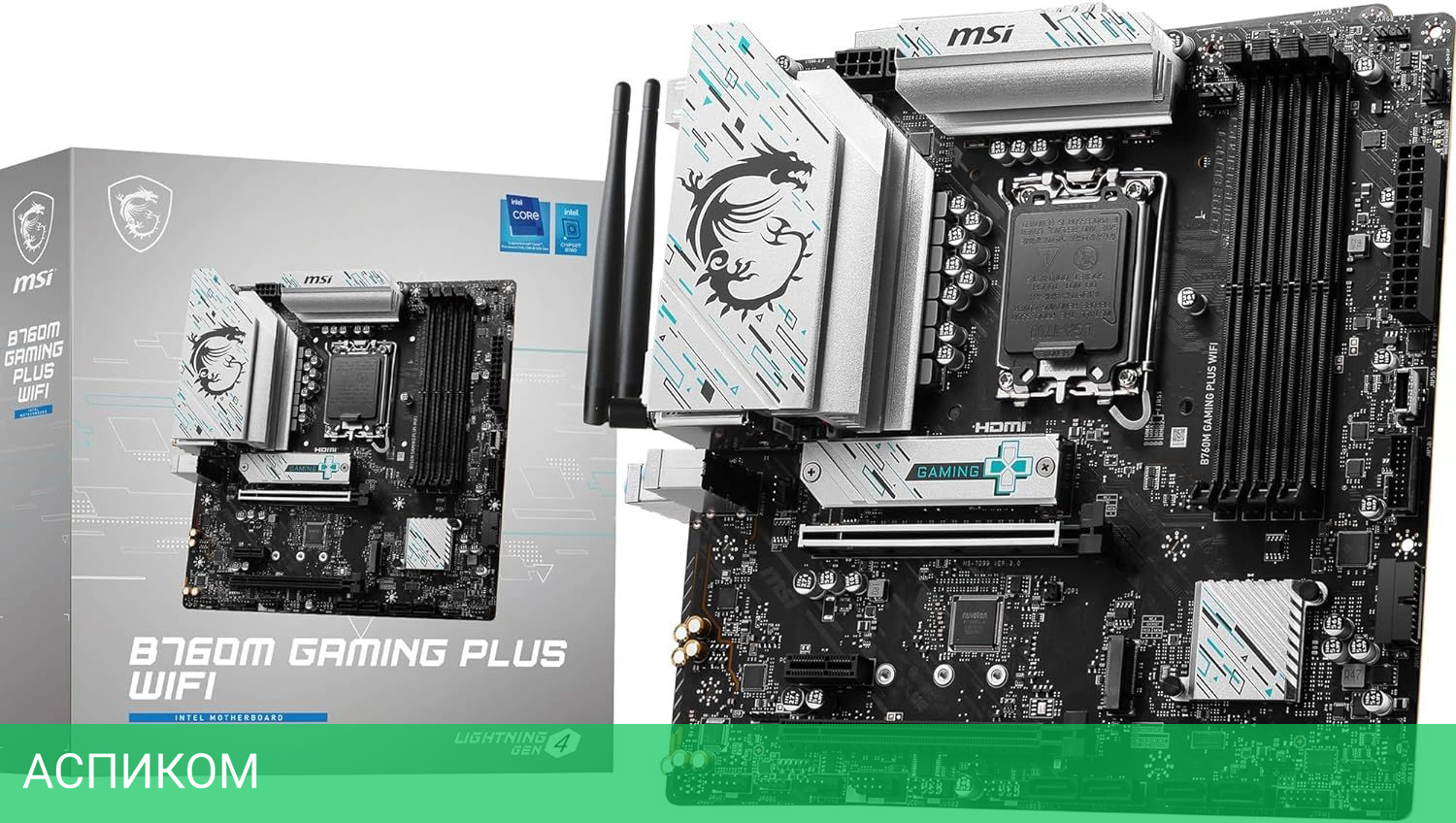 Материнская плата MSI B760M Gaming Plus WIFI DDR5/LGA1700/mATX/Intel B760/4xDDR5/4xSATA 3.0/2xM.2/Realtek ALC897/8 каналов (7.1)/3x3.5 мм jack/2xDP/1x2.5 Gigabit/RAID/4x USB 2.0/2x PCIe x16/1x PCIe x1/2xHDMI/1xCOM (внутр.)/1xPS/2