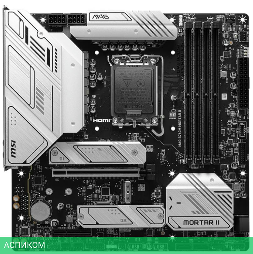 Материнская плата MSI MAG B760M Mortar WiFi II DDR5/LGA1700/mATX/Intel B760/4xDDR5/4xSATA 3.0/3xM.2/Realtek ALC897/8 каналов (7.1)/5x3.5 мм jack/1xDP/1x2.5 Gigabit/RAID/4x USB 2.0 (+4 внутренних)/3x USB 3.2 Gen2 Type-A/1x USB 3.2 Gen 2x2/1x PCIe x16 (1x PCIe 5.0 x16)/1x PCIe x4/1xHDMI/BT, WiFi/1хWIFI slot