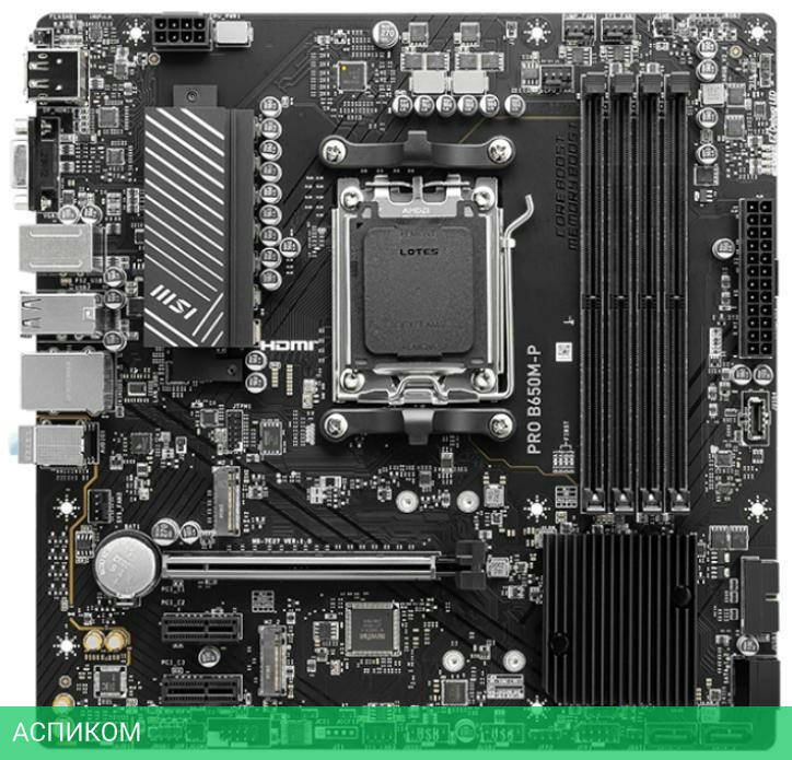 Материнская плата MSI Pro B650M-P DDR5/AM5/mATX/AMD B650/4xDDR5/4xSATA 3.0/2xM.2/Realtek ALC897/8 каналов (7.1)/3x3.5 мм jack/1xDP/1x2.5 Gigabit/RAID/4x USB 2.0 (+4 внутренних)/2x USB 3.2 Gen1 Type-A (+2 внутренних)/2x USB 3.2 Gen2 Type-A/1x USB 3.2 Gen2 Type-C/1x PCIe x16 (1x PCIe 4.0 x16)/2x PCIe x1/1xHDMI/1xVGA (D-Sub)/1xCOM (внутр.)/1xPS/2