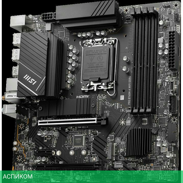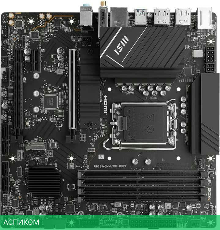 Материнская плата MSI Pro B760M-A WIFI DDR4/LGA1700/mATX/Intel B760/4xDDR4/4xSATA 3.0/2xM.2/Realtek ALC897/8 каналов (7.1)/3x3.5 мм jack/2xDP/1x2.5 Gigabit/RAID/2x USB 2.0 (+4 внутренних)/2x USB 3.2 Gen1 Type-A (+4 внутренних)/2x USB 3.2 Gen2 Type-A/1x USB 3.2 Gen1 Type-C/2x PCIe x16/1x PCIe x1/2xHDMI/BT, WiFi/1xPS/2