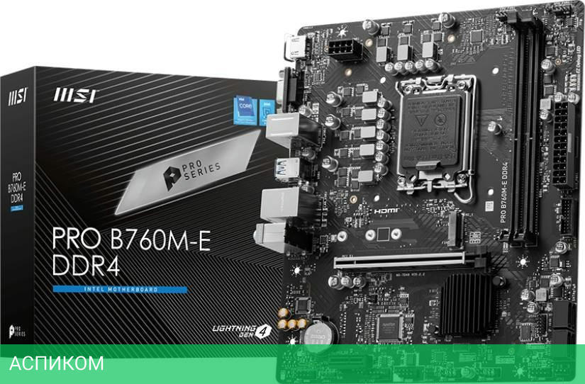 Материнская плата MSI Pro B760M-E DDR4/LGA1700/mATX/Intel B760/2xDDR4/4xSATA 3.0/1xM.2/Realtek ALC897/8 каналов (7.1)/3x3.5 мм jack/1x1 Gigabit/RAID/4x USB 2.0 (+4 внутренних)/2x USB 3.2 Gen1 Type-A (+2 внутренних)/1x PCIe x16 (1x PCIe 4.0 x16)/1x PCIe x1 (1x PCIe 3.0 x1)/1xHDMI/1xVGA (D-Sub)/1xCOM (внутр.)/1xPS/2