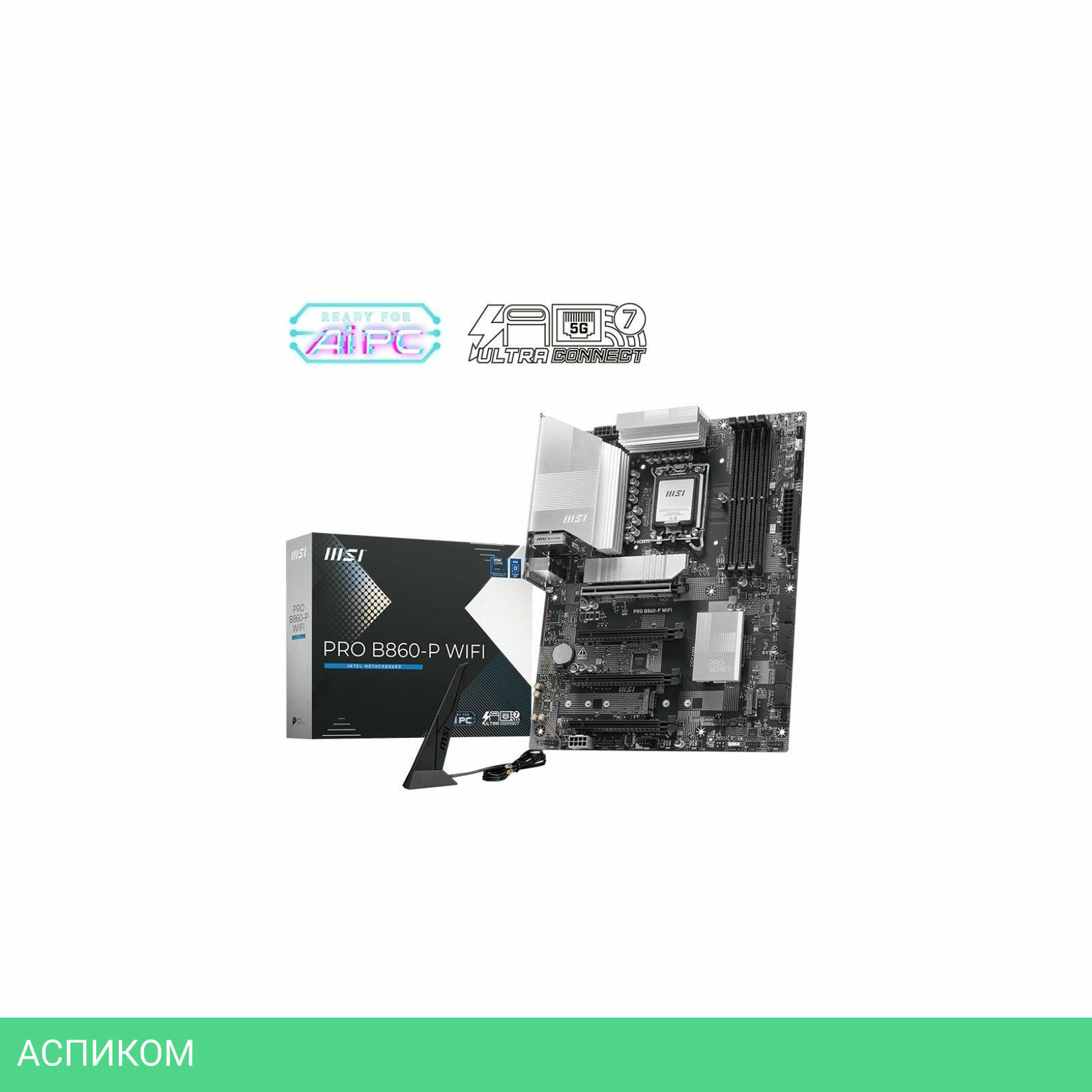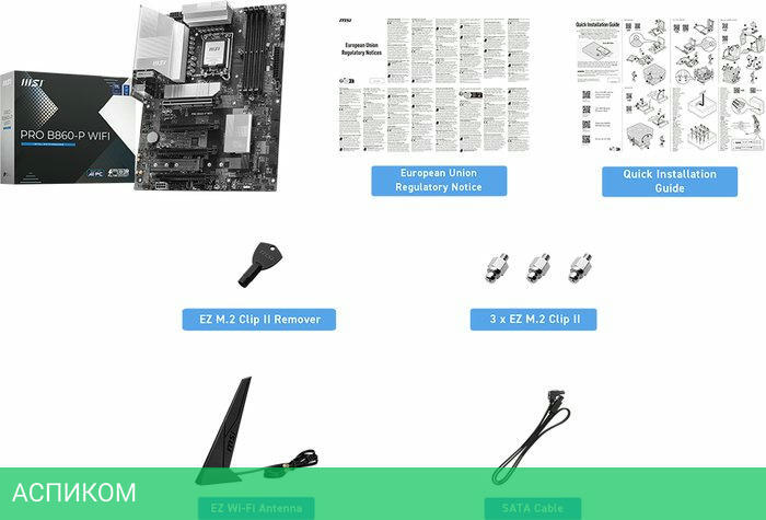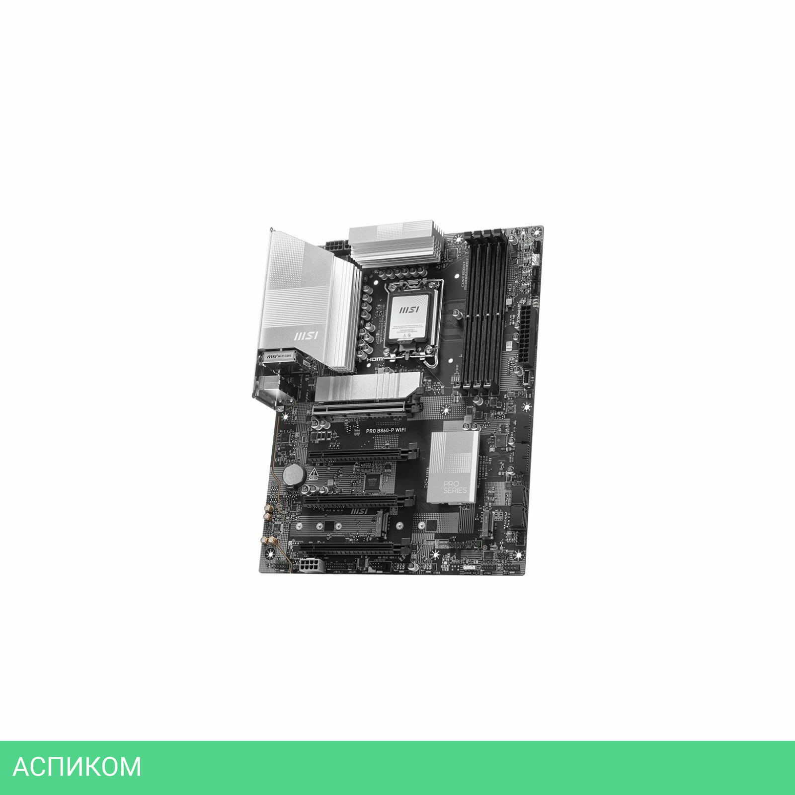 Материнская плата MSI Pro B860-P WIFI/LGA1851/ATX/Intel B860/4xDDR5, DDR5 CUDIMM/4xSATA 3.0/3xM.2/Realtek ALC897/8 каналов (7.1)/3x3.5 мм jack/1xDP/1x5 Gigabit/RAID/4x USB 2.0 (+4 внутренних)/2x USB 3.2 Gen1 Type-A (+4 внутренних)/2x USB 3.2 Gen2 Type-A/1x USB 3.2 Gen2 Type-C (внутренних)/4x PCIe x16/1xHDMI/BT, WiFi/1xCOM (внутр.)