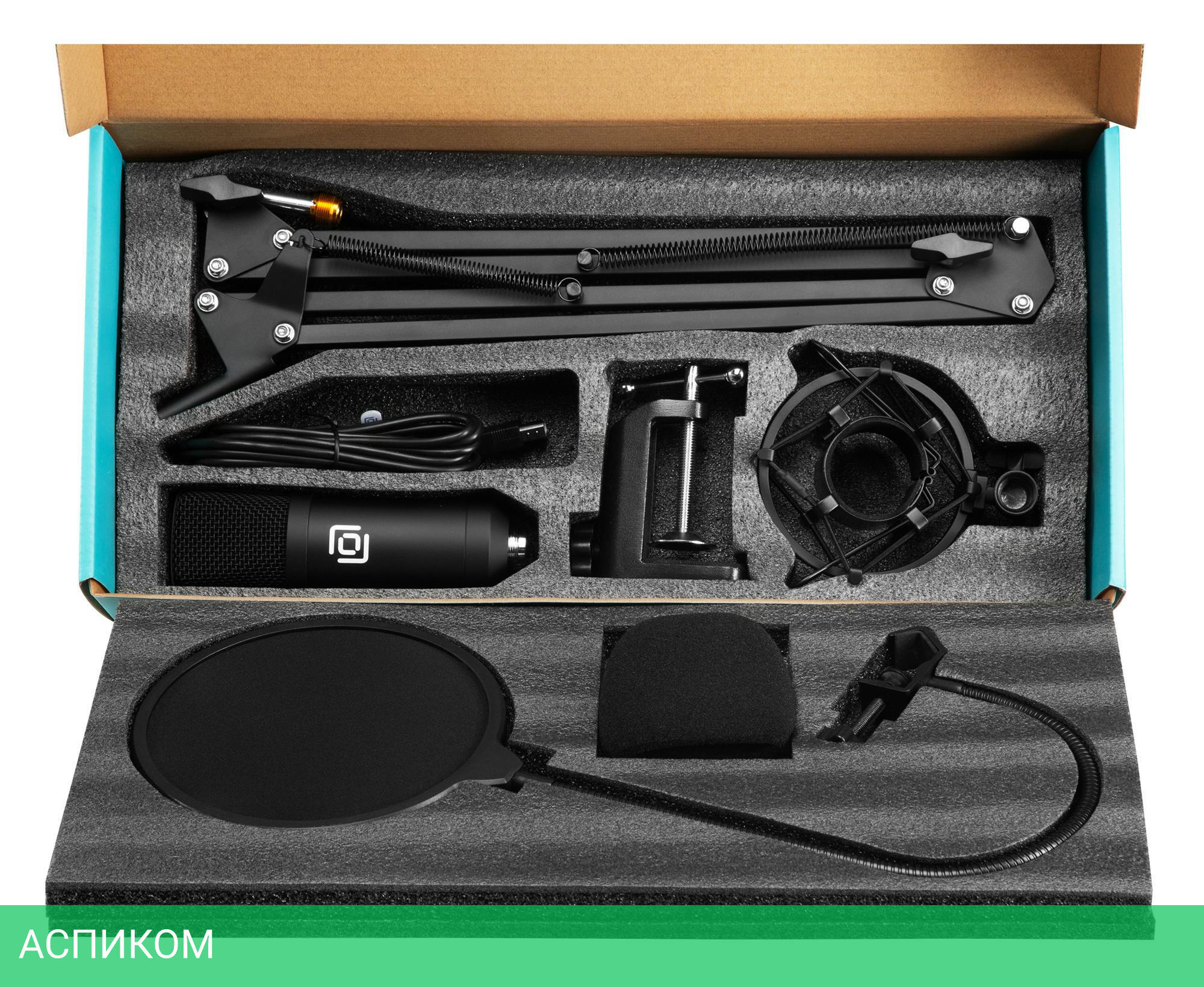 Микрофон, амортизационная опора, держатель для микрофона, настольный зажим, USB-кабель, поп-фильтр, поролоновая насадка (защита от ветра), руководство пользователя