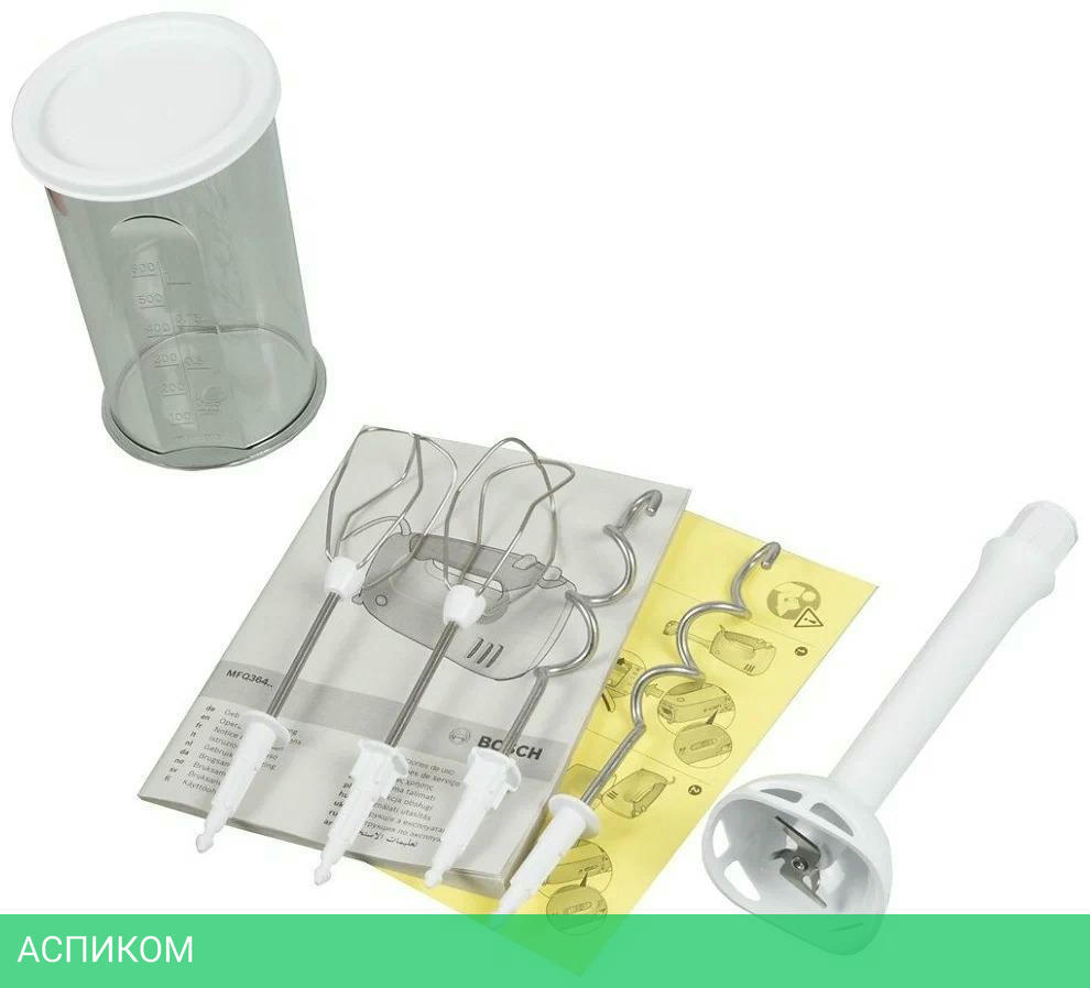 миксер, насадка блендер, стакан, крышка, венчики для взбивания, крюки для замешивания