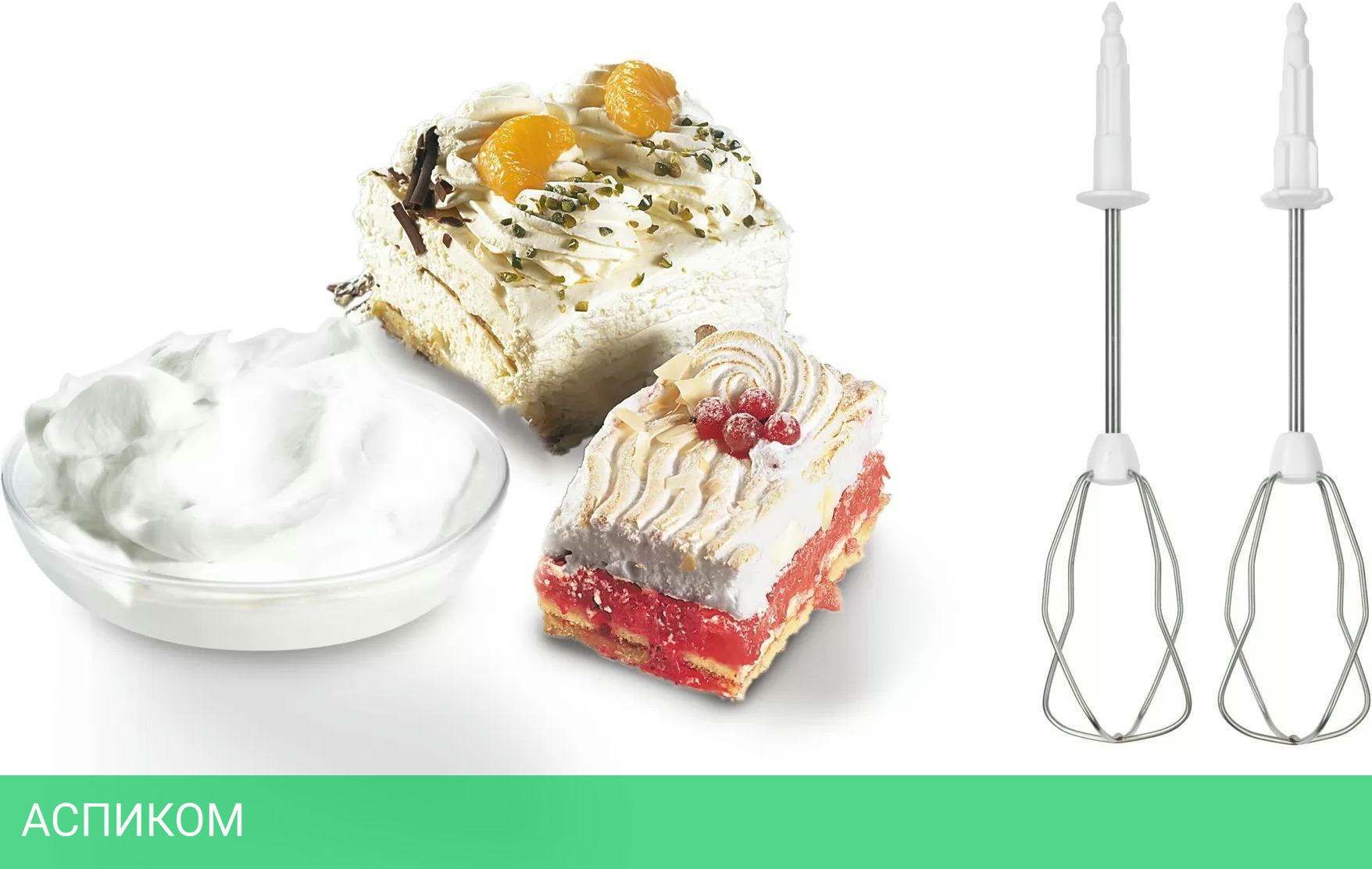 2 венчика для взбивания, 2 крюка для замеса теста, ножка блендера, стакан для перерабатываемых продуктов, крышка