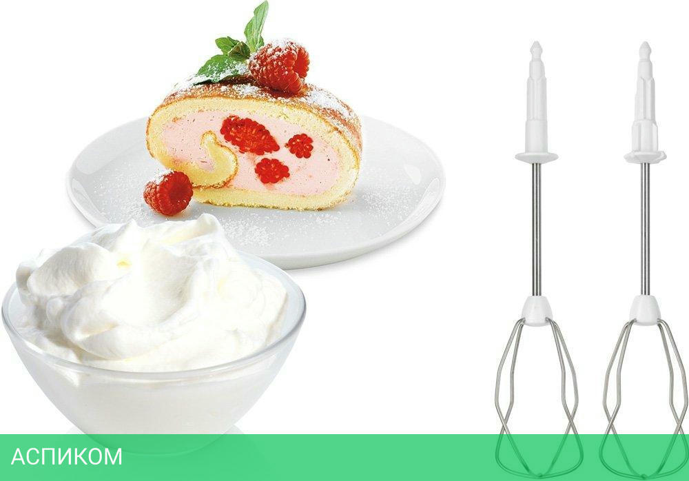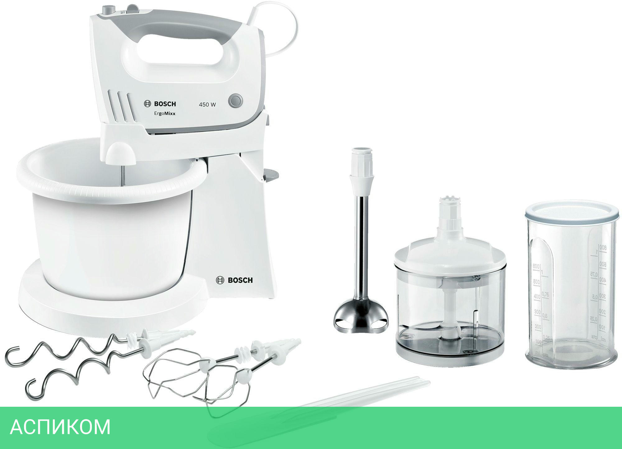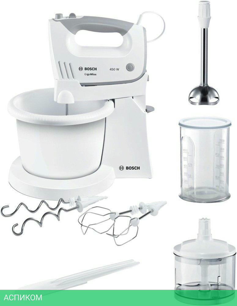 ножка-блендер – 1 шт.; венчики для взбивания – 2 шт.; крюки для теста – 2 шт.; измельчитель – 1 шт.; стакан с мерной шкалой – 1 шт.; миксер – 1 шт.; подставка – 1 шт.; чаша для смешивания – 1 шт