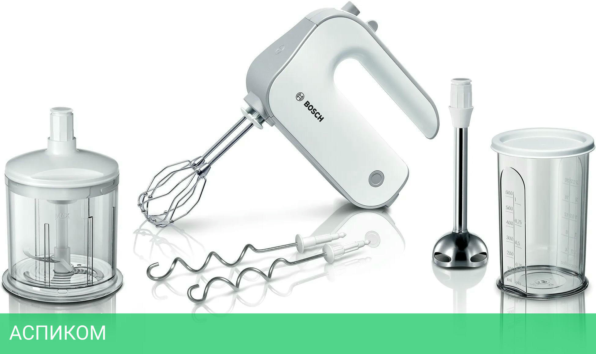 миксер, венчики для взбивания, крюки для замешивания, блендер, измельчитель, мерный стакан, крышка, инструкция
