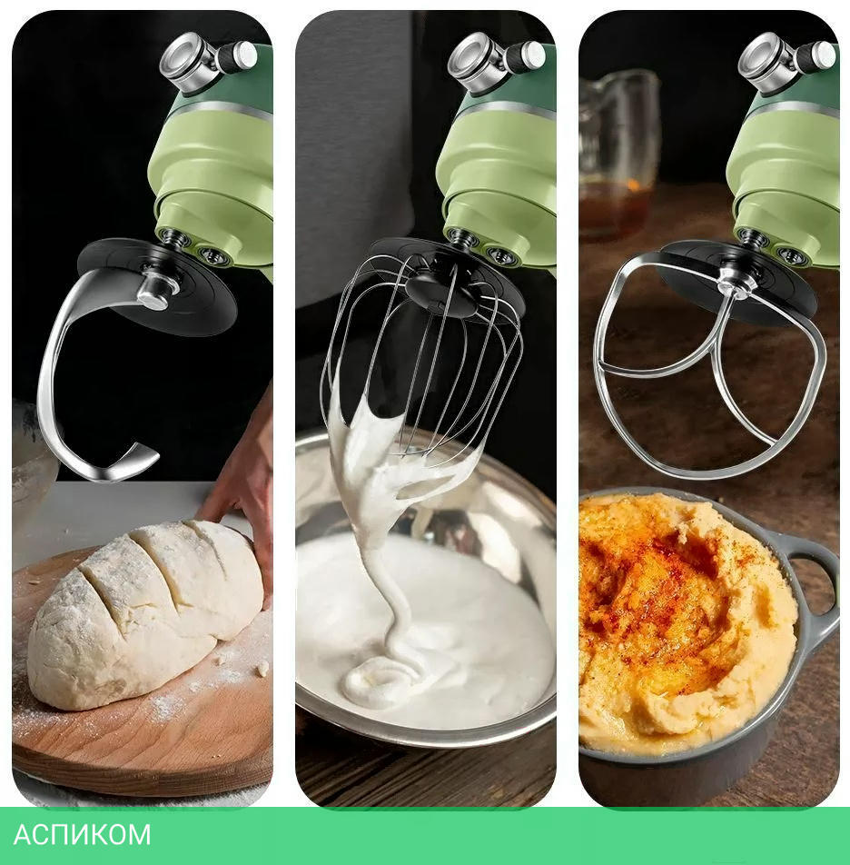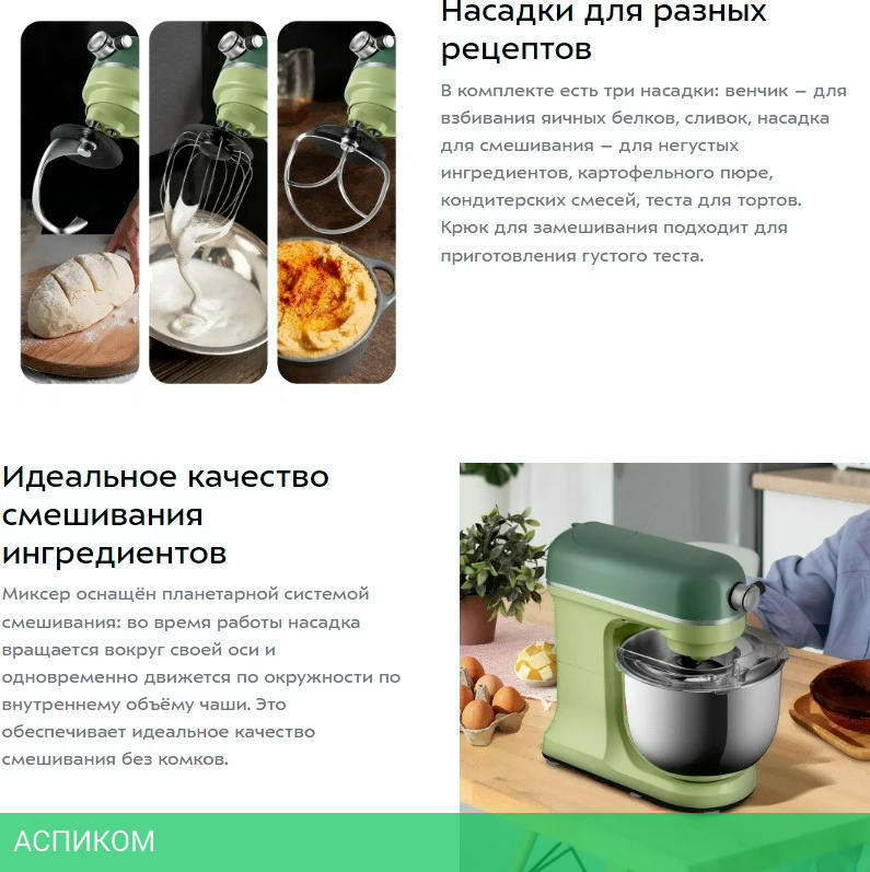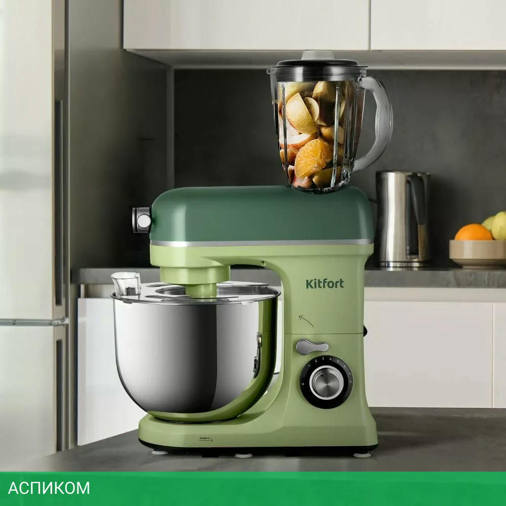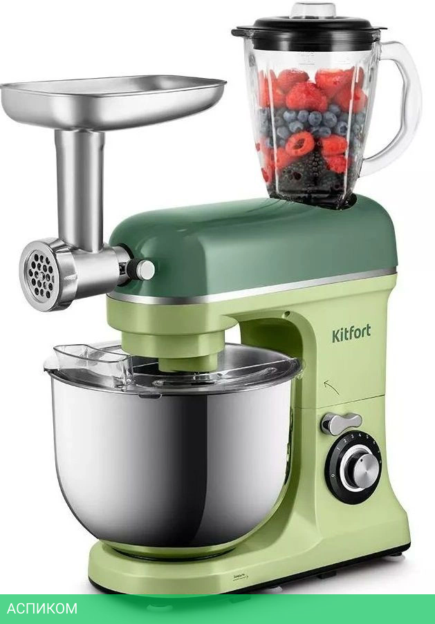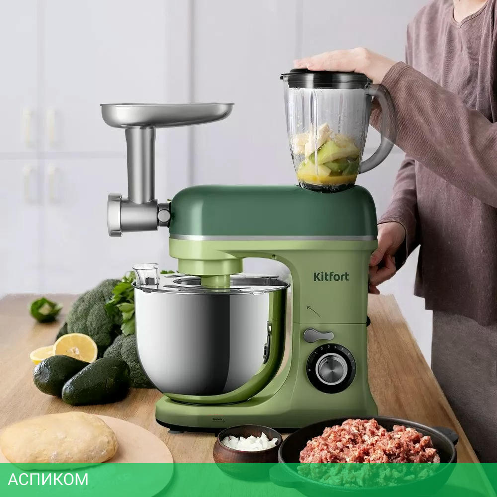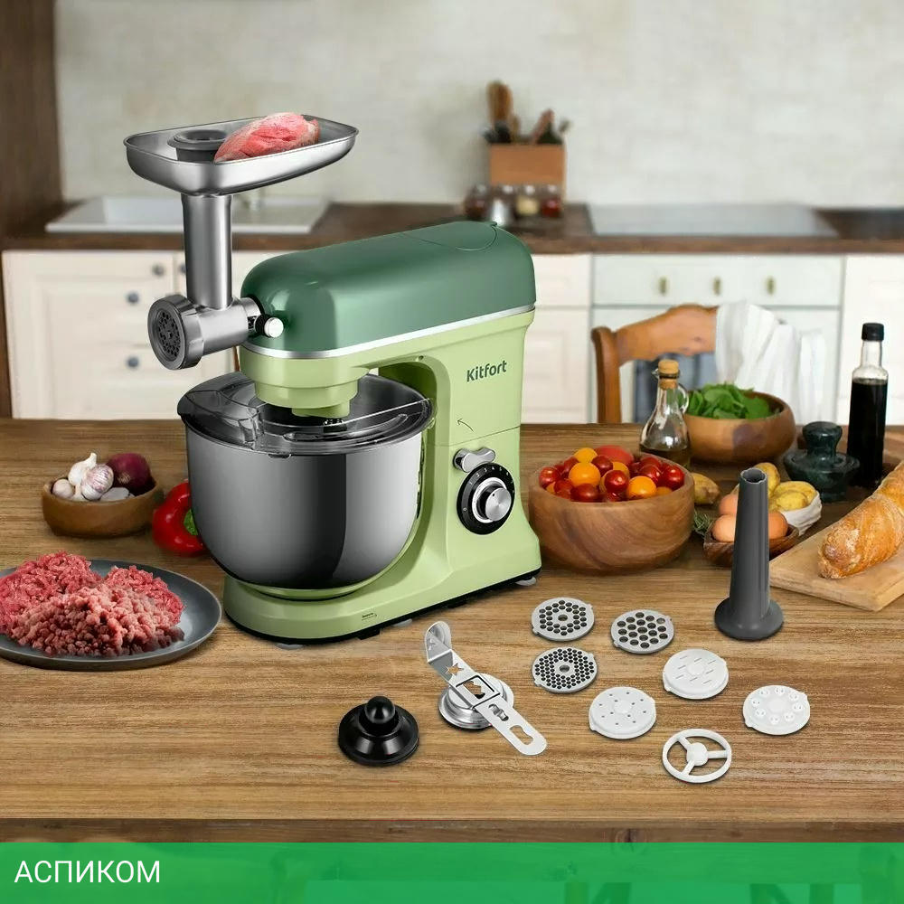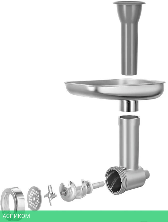 Ёмкость чаши блендера - 1,5 л Мясорубка имеет 3 решётки для изготовления фарша, специальные насадки для колбас и кеббе, 3 насадки для изготовления пасты и насадку для печенья.