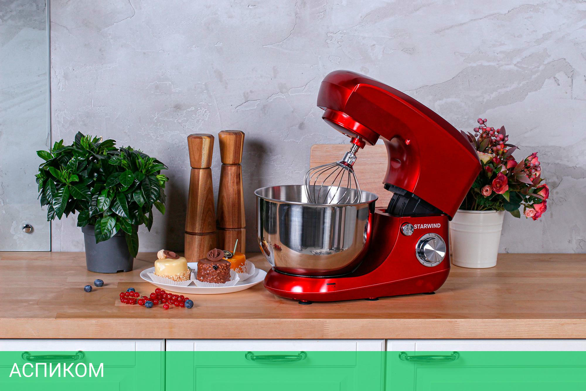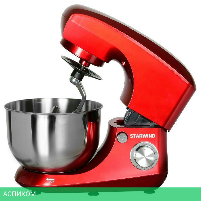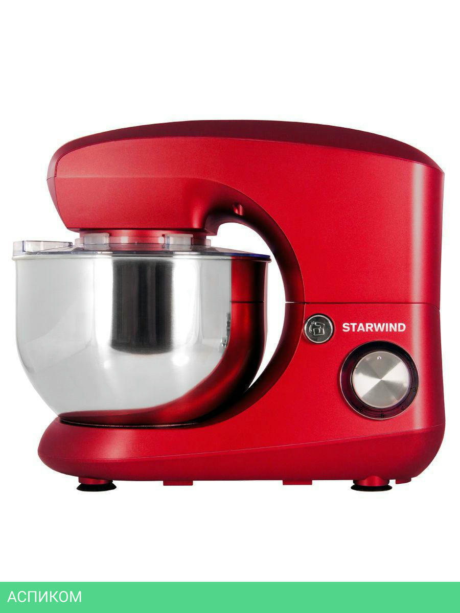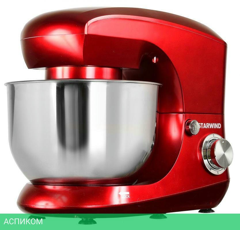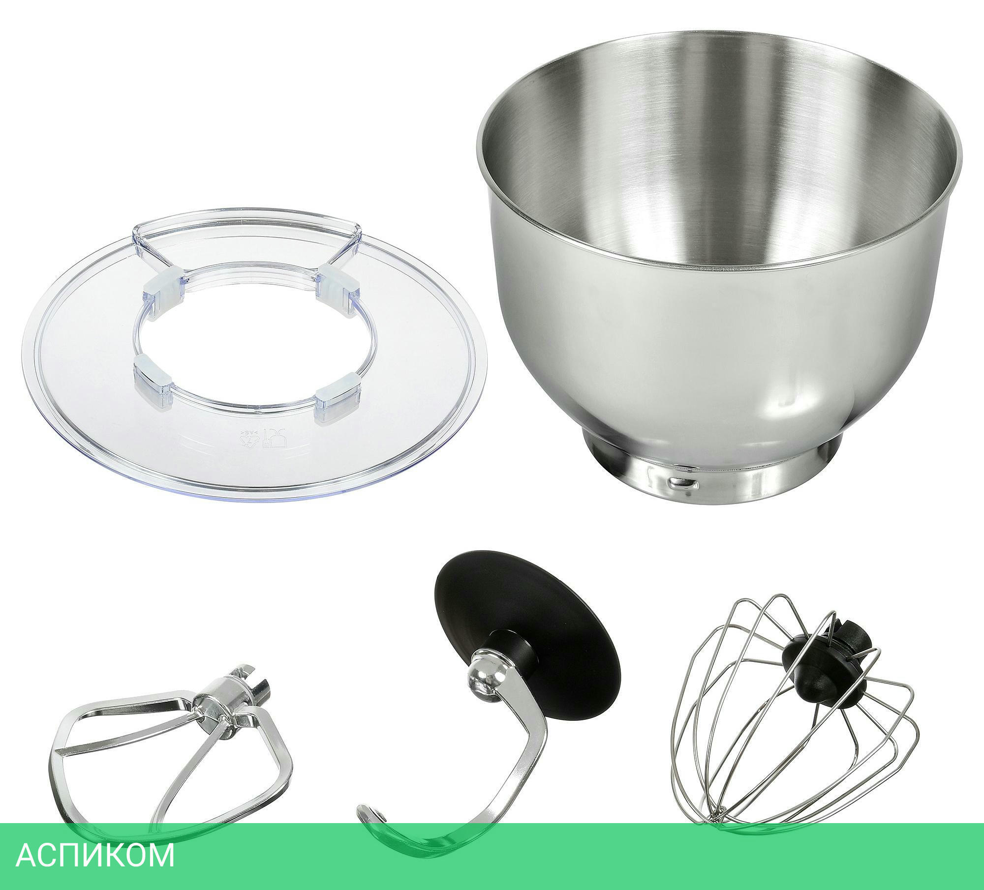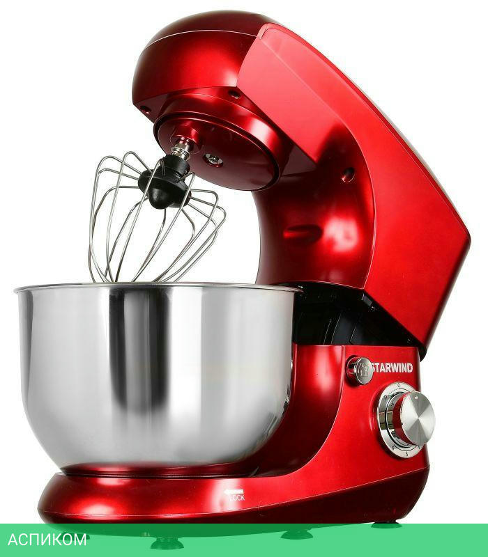 Миксер, чаша, щиток пластиковый, лопатка для перемешивания, крюк для замешивания теста, венчик для взбивания, инструкция