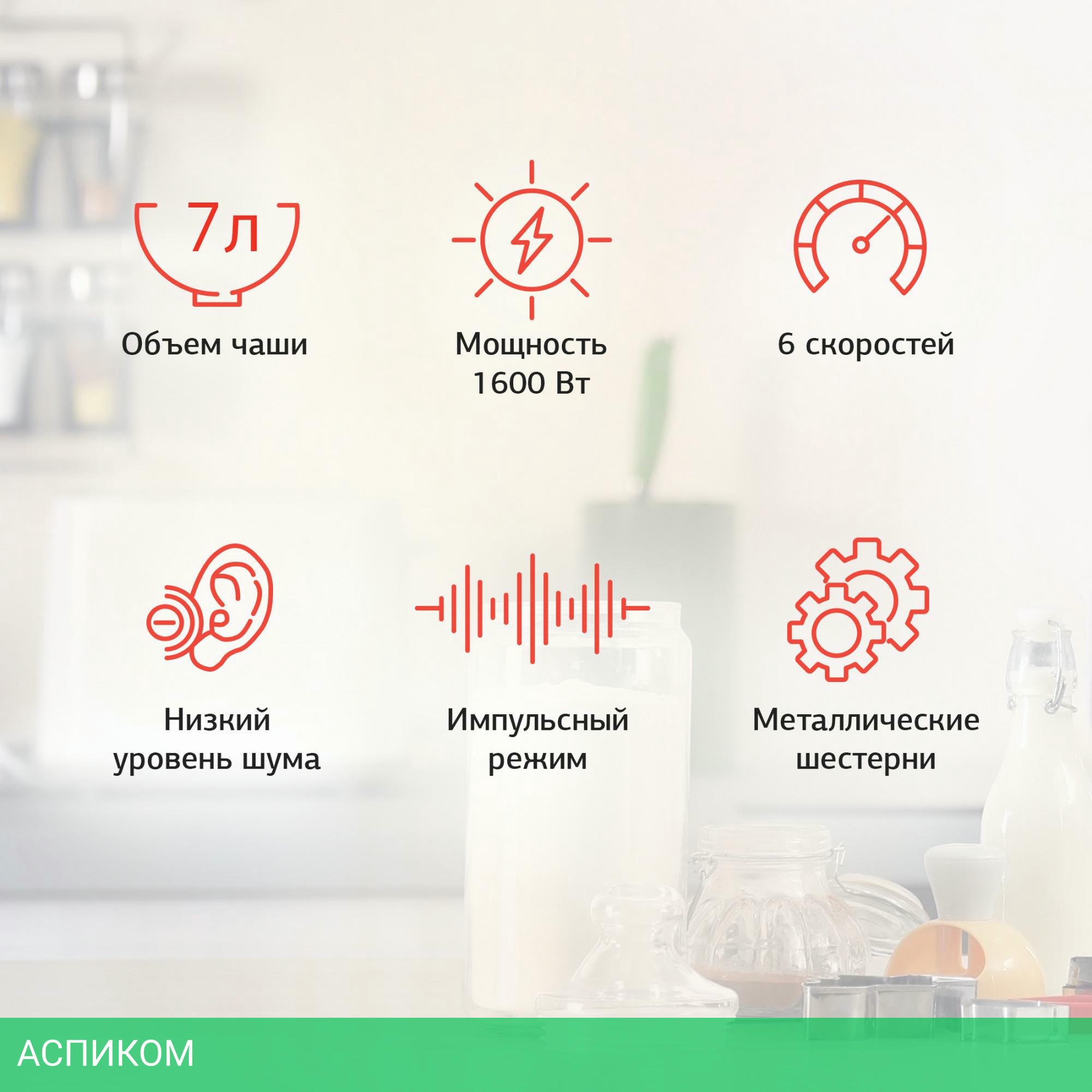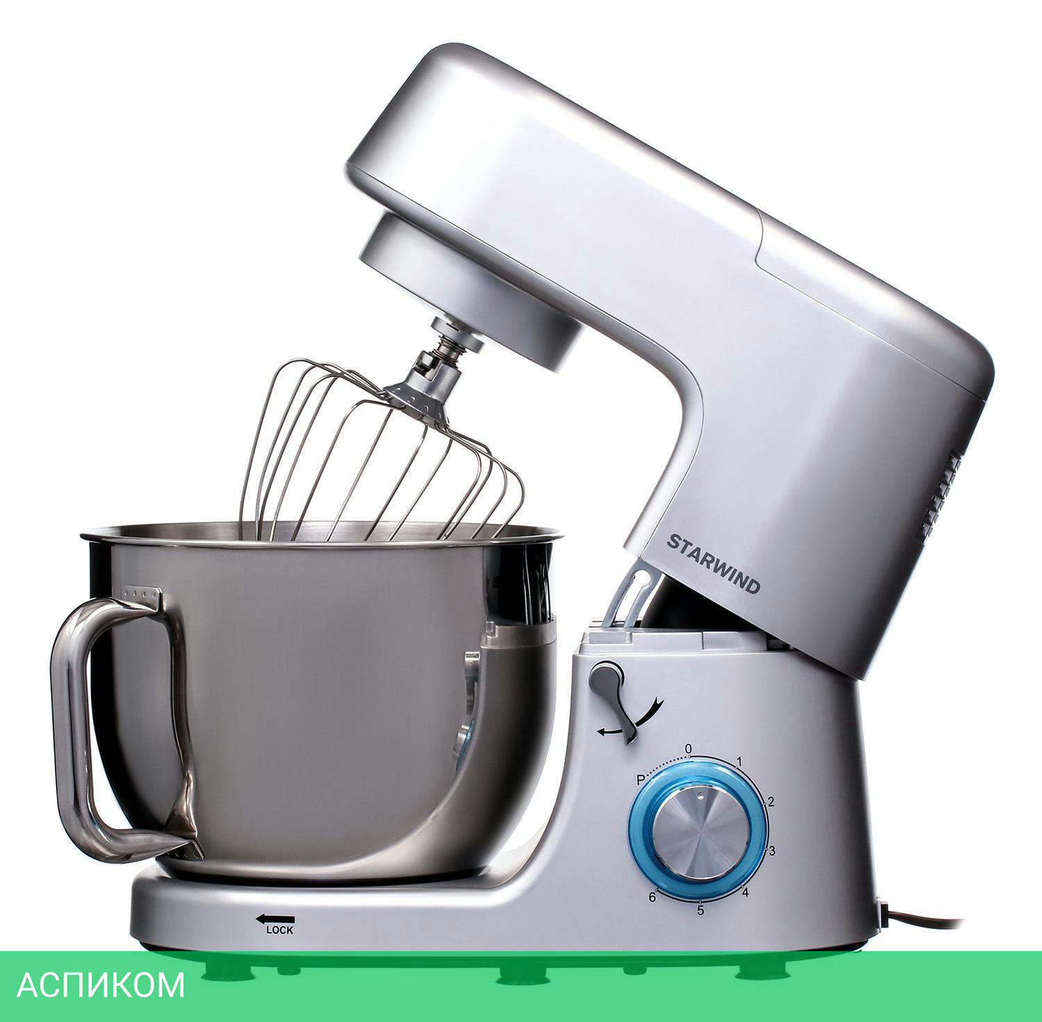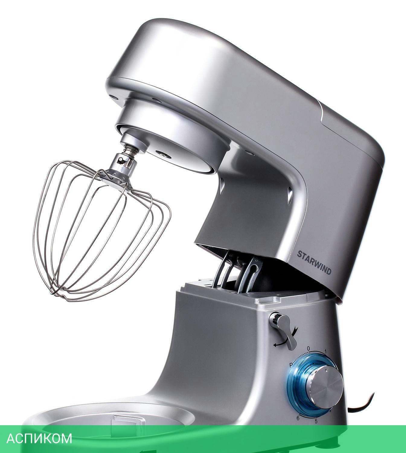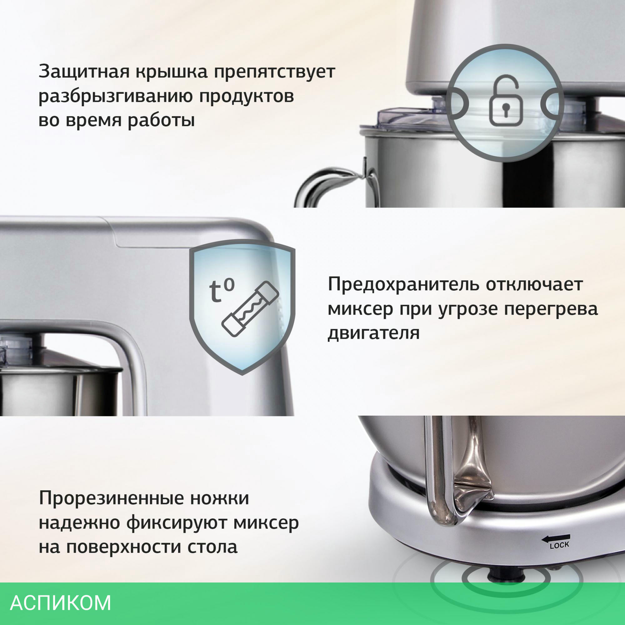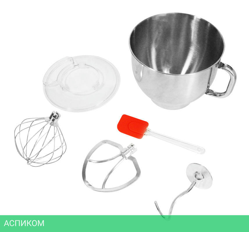 Миксер, чаша, крышка для чаши, крюки для замеса теста, лопатка для перемешивания, венчик для взбивания, инструкция
