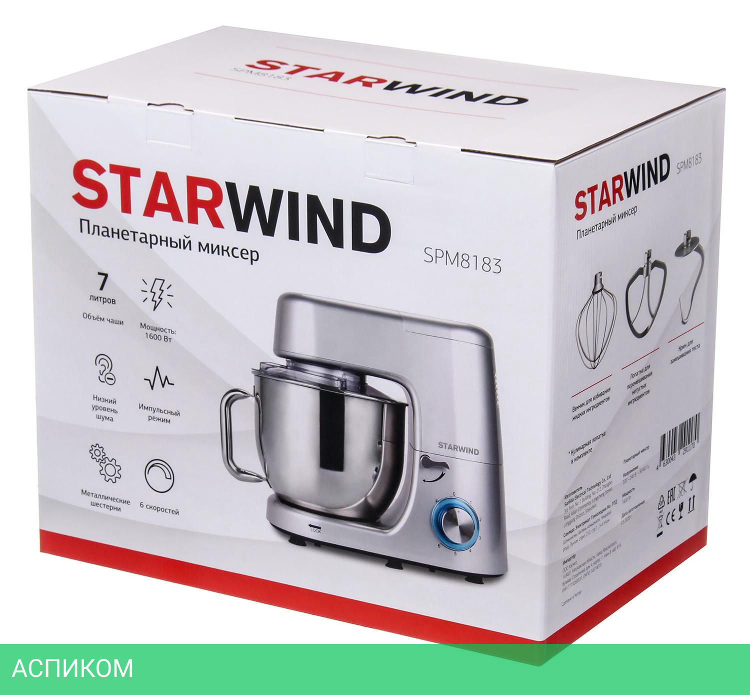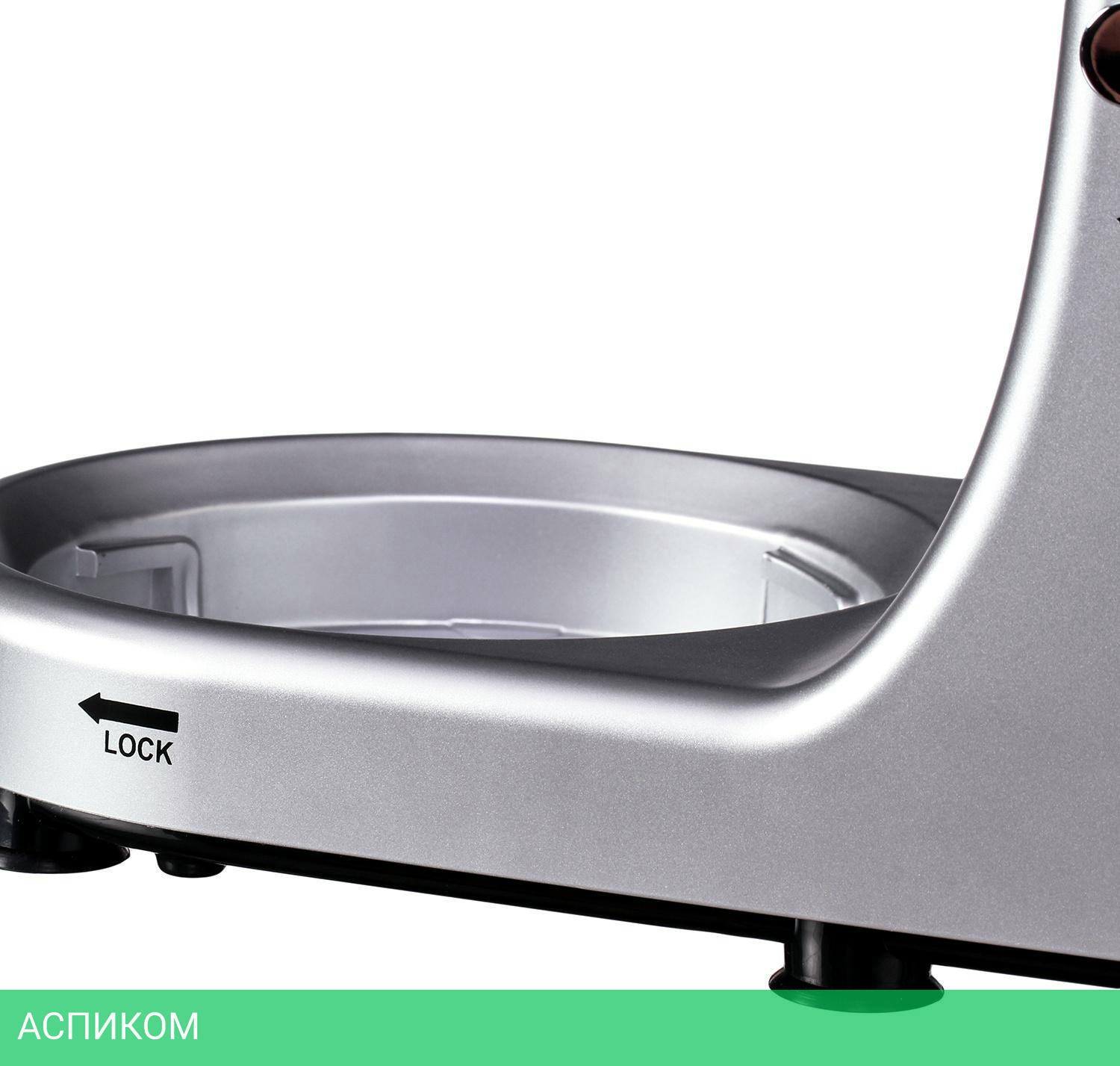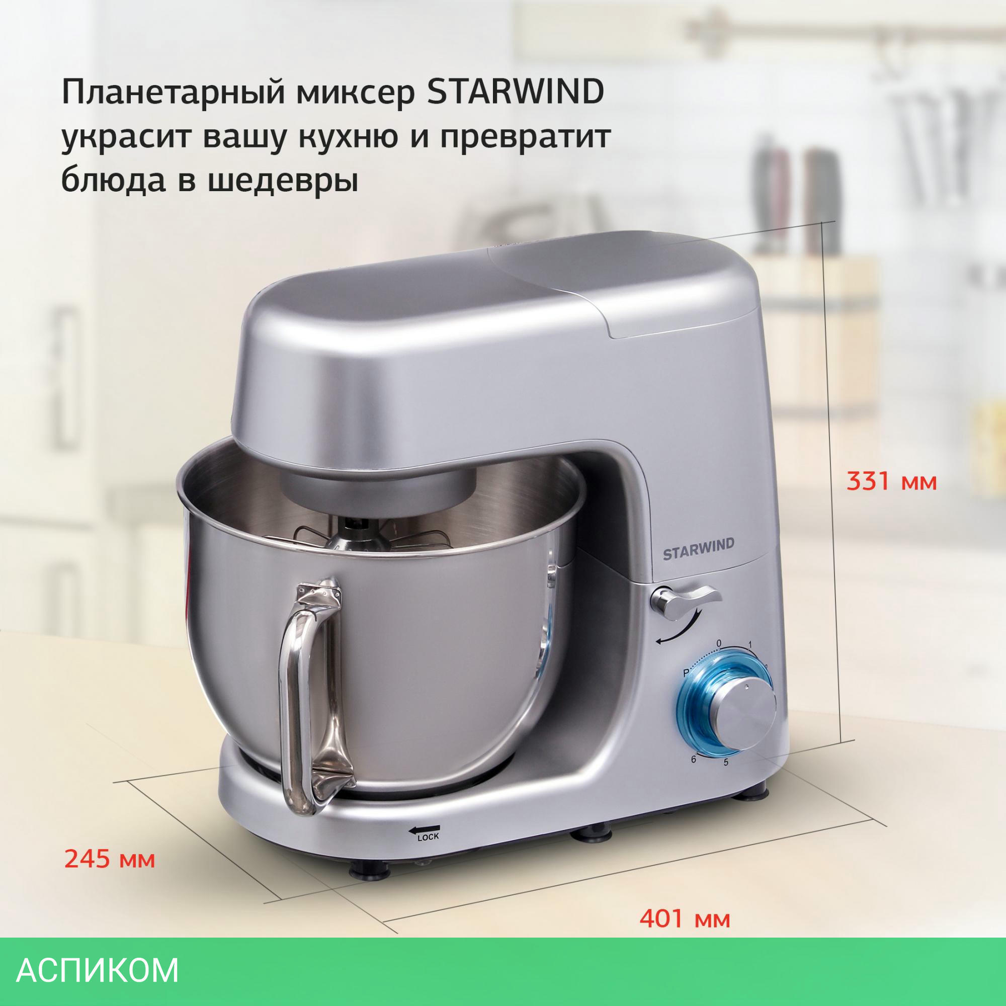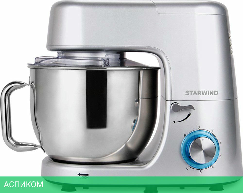 Миксер, чаша, крышка для чаши, крюки для замеса теста, лопатка для перемешивания, венчик для взбивания, инструкция