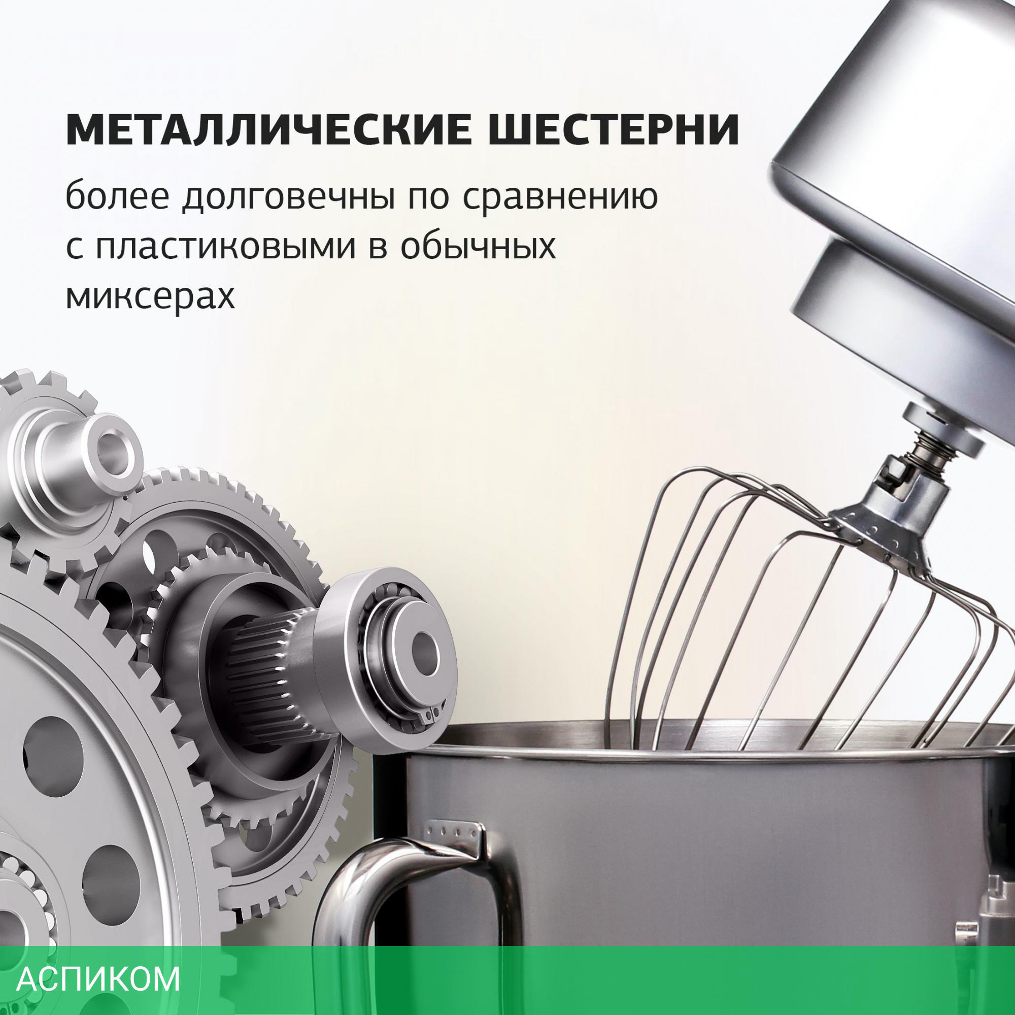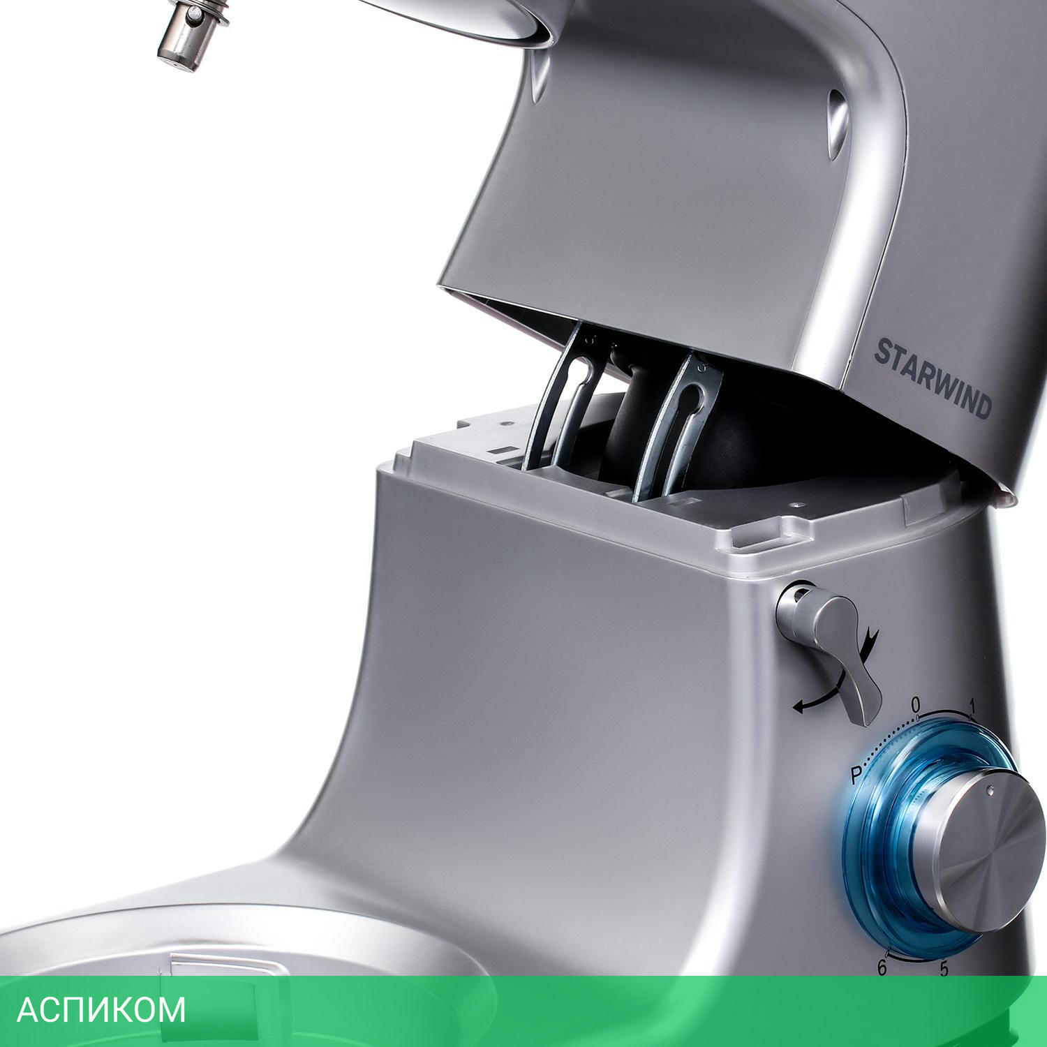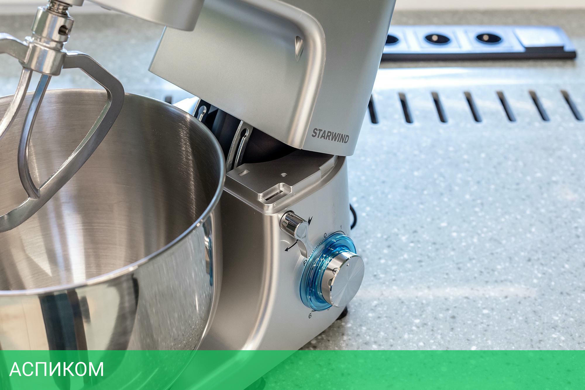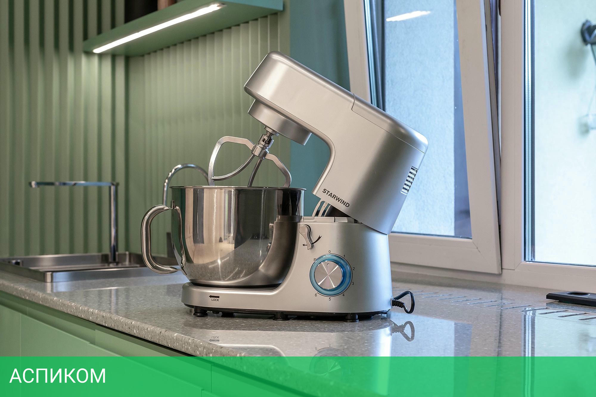 Миксер, чаша, крышка для чаши, крюки для замеса теста, лопатка для перемешивания, венчик для взбивания, инструкция