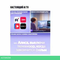 Но это ещё не всё — встроенный искусственный интеллект в телевизоре Яндекса непрерывно анализирует изображение на экране, автоматически настраивая параметры для достижения идеального качества картинки. Каждый кадр становится более чётким, ярким и насыщенным благодаря умной обработке изображения.