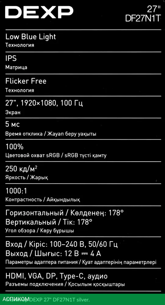 - Видеовходы: DisplayPort, HDMI, USB, VGA