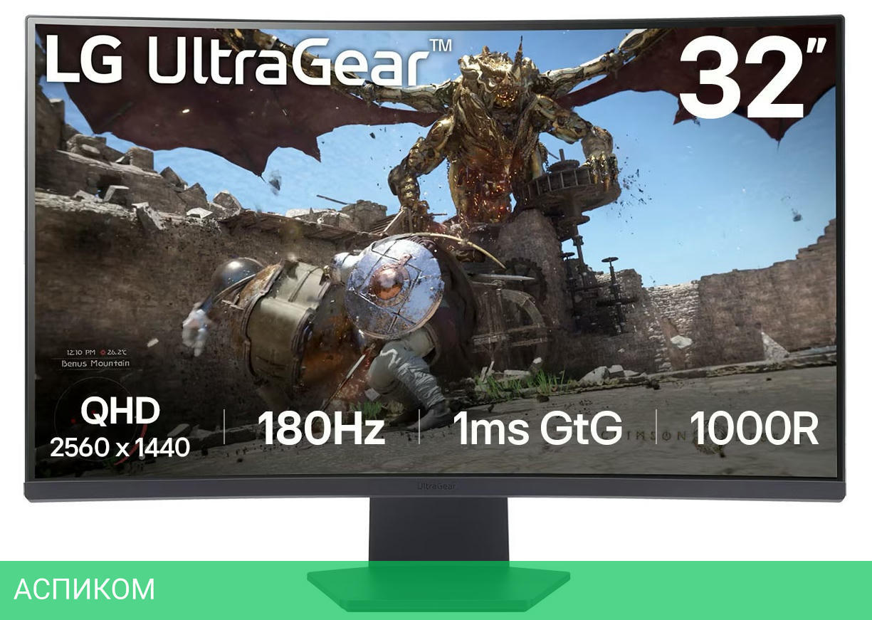 Монитор LG UltraGear 32GS60QC-B/VA/31.5″/16:9/2560x1440/180Hz/Curved/1000R/матовый/178гр/178гр/1ms/DisplayPort/AMD FreeSync/300cd/черный