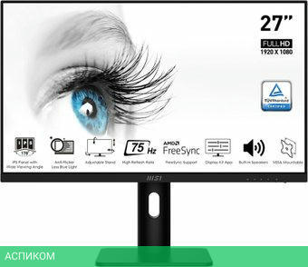 <p> 27", 1920x1080, 16:9, IPS, 75 Гц, глубина 8 бит, яркость 250 нит, динамики, HDMI+DisplayPort, регулировка высоты, портретный режим </p>