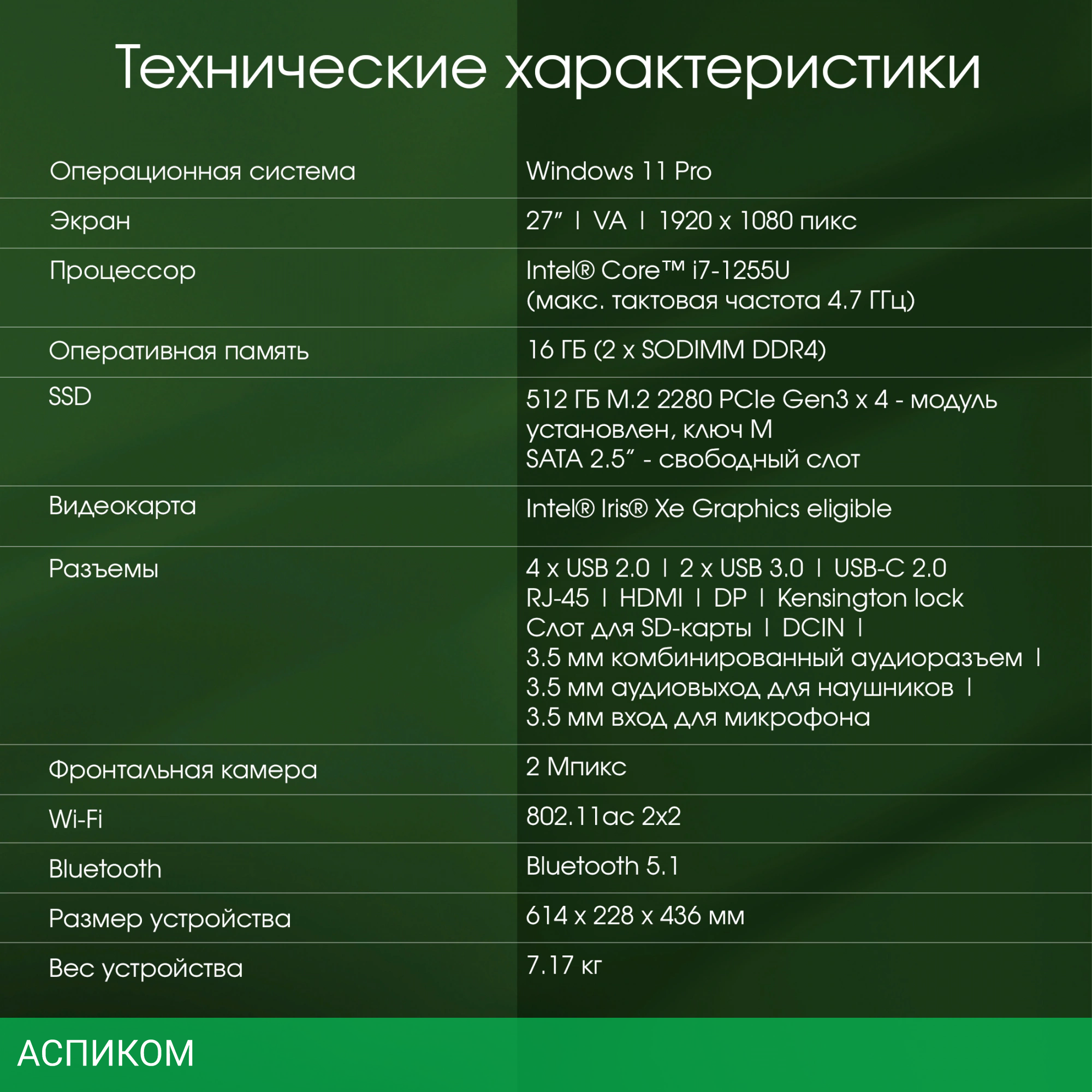 Моноблок Digma Pro Unity серый (DM27P7-ADXW04)/27″/VA/1920x1080/220N/Intel Core i7 1255U/16ГБ/SSD 512 ГБ/UMA/Windows 11/GbitEth/Wi-Fi/BT/CAM/Black/кл+м