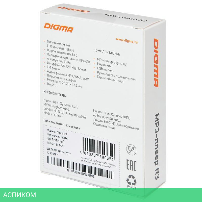 плеер / WMA; MP3 / 0.8" / черный / 8.0 / microSDHC / нет / пластик