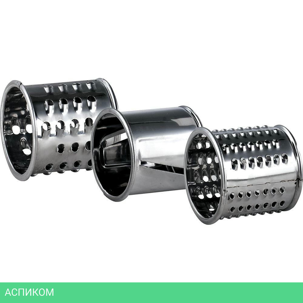 В комплекте: 2 решетки из высококачесвенной стали (5 мм, 7 мм); Лоток для мяса из высококачественного пластика; Пластиковый толкатель; Овощерезка (3 барабана); Крупная терка; Мелкая терка; Терка для шинкования.