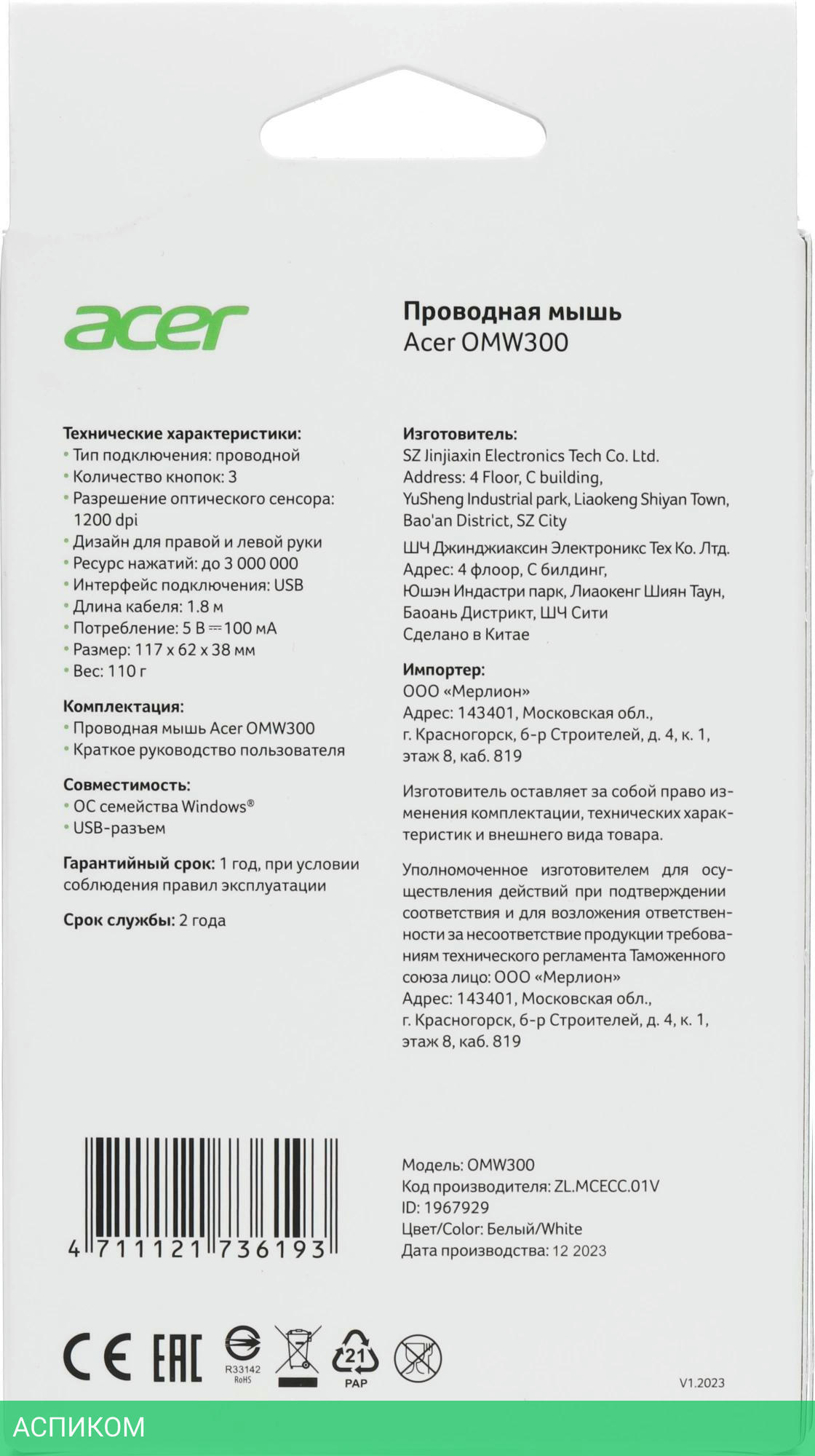 мышь / для ПК / полноразмерная / проводная USB / белый / оптический / да / 1200.0 / нет / 3 / 1.8