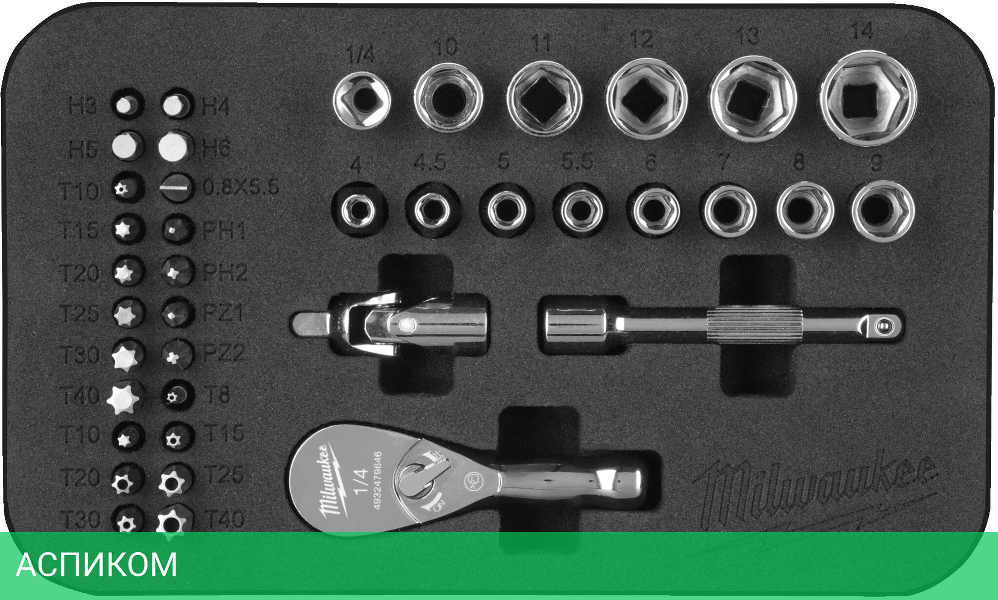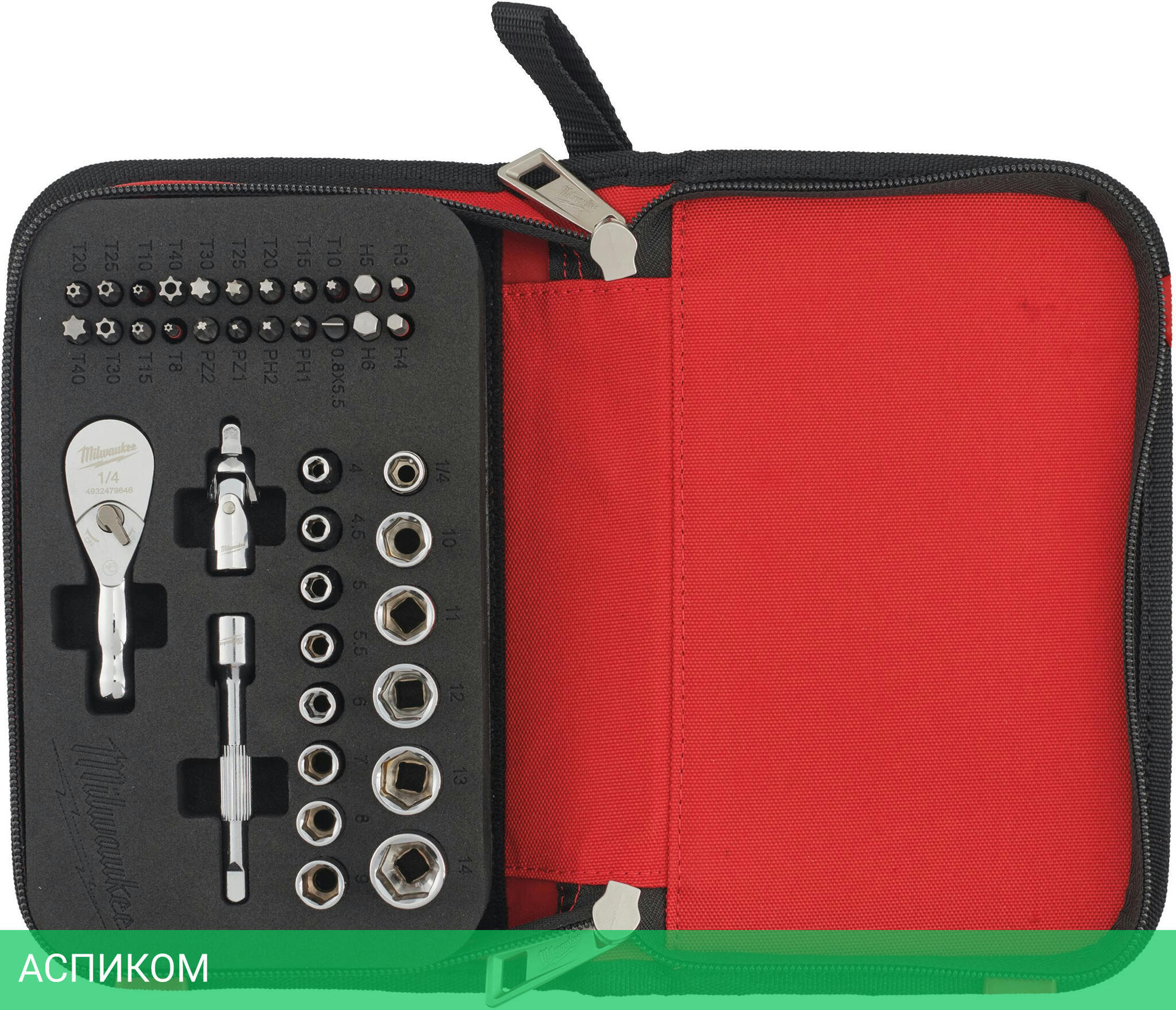 компактный храповой ключ ¼″, универсальный шарнир ¼″, удлинитель 76 мм, 13 головок ¼″ (4, 4,5, 5, 5,5, 6, 7, 8, 9, 10, 11, 12, 13, 14 мм), адаптер с квадратной на квадратную головку ¼″, 22 биты SHOCKWAVE™ IMPACT DUTY (PH1, PH2, PZ1, PZ2, TX BO8, TX BO10, TX BO15, TX BO20, TX BO25, TX BO30, TX BO40, SL0.8x5x5, TX 10, TX 15, TX 20, TX 25, TX 30, TX 40, шестигранник 3 мм, шестигранник 4 мм, шестигранник 5 мм, шестигранник 6 мм